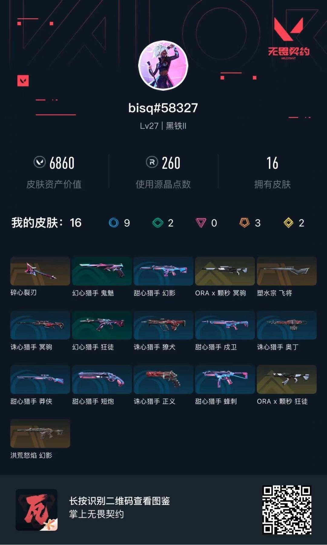 [14581424]3橙皮 2金皮 16皮肤 8英雄 17卡面 260已用源晶 黑铁段位 【近战武器皮肤】:碎心裂刃 【步呛皮肤】:狂徒-ax颗秒幻影-洪荒怒焰 【狙击呛皮肤】:冥驹-ax颗秒飞将-塑水宗