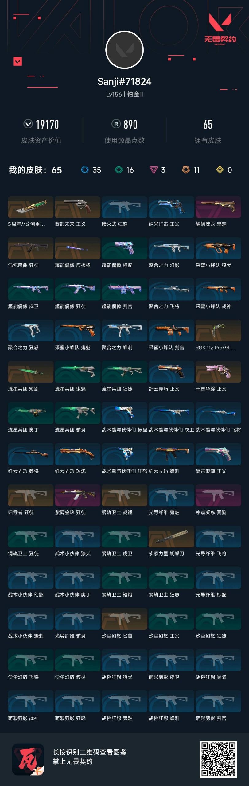 11橙皮 3紫皮 65皮肤 26英雄 115卡面 890已用源晶 铂金段位 【近战武器皮肤】:战锤-钢轨卫士短剑-流星兵团苍龙之刃蝴蝶刀-侦察力量爪刀-rgx 11z pro 3.0匕首-沙尘幻旅超能偶像 应援棒 【佩呛皮肤】:正义-西部未来正义-千灵华绽鬼魅-耀鳞威龙 【步呛皮肤