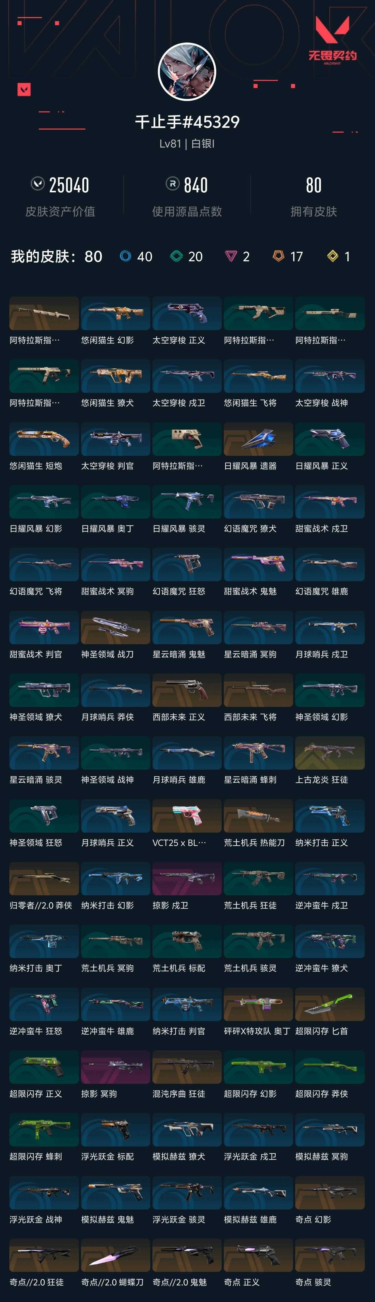 【无畏契约】【yhwww7126】等级:81,已用无畏点25040,已用源晶点840,橙皮:奥丁-砰砰x特攻队|骇灵-奇点|幻影-奇点|近战-超限闪存 匕首|狂徒-混沌序曲|正义-奇点|狂徒-奇点2.0|鬼魅-奇点2.0|近战-奇点2.0 蝴蝶刀|近战-荒土机兵 热能刀|莽侠-归零者2.0|近战-神圣领域 战刀|标配-vct25 x blg|飞将-西部未来|正义-西部未来|近战-日耀风暴 遗器|近战-阿特拉斯指挥部 甩棍__段位:白银__紫皮:冥驹-掠影|戍卫-掠影__蓝皮:判官-纳米打击|正义-纳米打击|奥丁-纳米打击|幻影-纳米打击|雄鹿-逆冲蛮牛|狂怒-逆冲蛮牛|戍卫-逆冲蛮牛|獠犬-逆冲蛮牛|鬼魅-星云暗涌|骇灵-星云暗涌|正义-月球哨兵|莽侠-月球哨兵|戍卫-月球哨兵|雄鹿-月球哨兵|骇灵-浮光跃金|标配-浮光跃金|戍卫-浮光跃金|战神-浮光跃金|鬼魅-模拟赫兹|獠犬-模拟赫兹|冥驹-模拟赫兹|雄鹿-模拟赫兹|冥驹-星云暗涌|蜂刺-星云暗涌|鬼魅-甜蜜战术|判官-甜蜜战术|戍卫-甜蜜战术|雄鹿-幻语魔咒|獠犬-幻语魔咒|飞将-幻语魔咒|狂怒-幻语魔咒|正义-太空穿梭|战神-太空穿梭|判官-太空穿梭|戍卫-太空穿梭|骇灵-阿特拉斯指挥部|莽侠-阿特拉斯指挥部|标配-阿特拉斯指挥部|狂徒-阿特拉斯指挥部__绿皮:狂徒-荒土机兵|标配-荒土机兵|骇灵-荒土机兵|冥驹-荒土机兵|獠犬-神圣领域|狂怒-神圣领域|战神-神圣领域|幻影-神圣领域|正义-超限闪存|莽侠-超限闪存|幻影-超限闪存|蜂刺-超限闪存|正义-日耀风暴|幻影-日耀风暴|奥丁-日耀风暴|短炮-悠闲猫生|飞将-悠闲猫生|幻影-悠闲猫生|獠犬-悠闲猫生__金皮:狂徒-上古龙炎__英雄:尚勃勒|维斯|黑梦|斯凯|暮蝶|盖可|霓虹|壹决|k/o|幽影|夜露|钢锁|海神|奇乐|炼狱|铁臂|贤者|猎枭|钛狐|芮娜|零|捷风|蝰蛇|不死鸟|幻棱|雷兹