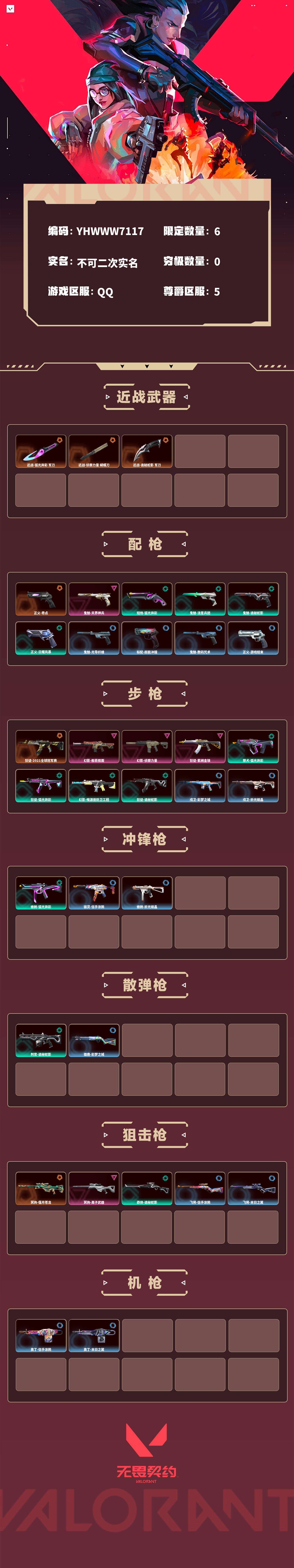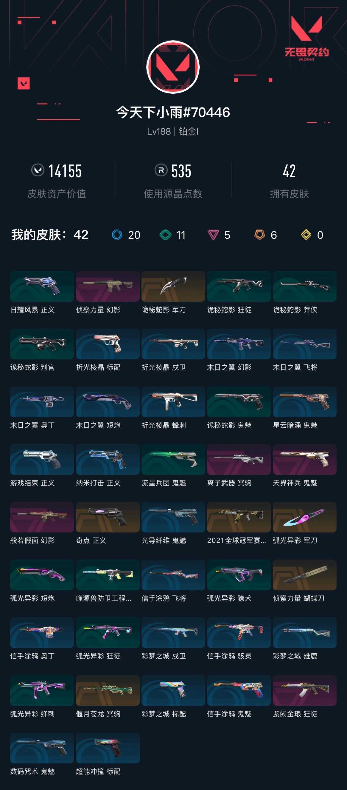 【无畏契约】【yhwww7117】等级:188,已用无畏点14155,已用源晶点535,橙皮:近战-弧光异彩 军刀|狂徒-2021全球冠军赛|正义-奇点|冥驹-偃月苍龙|近战-侦察力量 蝴蝶刀|近战-诡秘蛇影 军刀__紫皮:鬼魅-天界神兵|幻影-般若假面|幻影-侦察力量|冥驹-离子武器|狂徒-紫阙金琅__蓝皮:鬼魅-光导纤维|标配-超能冲撞|鬼魅-数码咒术|正义-游戏结束|正义-纳米打击|鬼魅-星云暗涌|戍卫-彩梦之城|雄鹿-彩梦之城|标配-彩梦之城|鬼魅-信手涂鸦|骇灵-信手涂鸦|奥丁-信手涂鸦|飞将-信手涂鸦|蜂刺-折光棱晶|戍卫-折光棱晶|标配-折光棱晶|飞将-末日之翼|幻影-末日之翼|短炮-末日之翼|奥丁-末日之翼__段位:铂金__绿皮:短炮-弧光异彩|獠犬-弧光异彩|蜂刺-弧光异彩|狂徒-弧光异彩|鬼魅-流星兵团|幻影-噬源兽防卫工程|判官-诡秘蛇影|鬼魅-诡秘蛇影|莽侠-诡秘蛇影|狂徒-诡秘蛇影|正义-日耀风暴__英雄:尚勃勒|维斯|黑梦|斯凯|暮蝶|盖可|霓虹|壹决|星礈|k/o|幽影|夜露|钢锁|海神|奇乐|炼狱|铁臂|贤者|猎枭|钛狐|芮娜|零|捷风|蝰蛇|不死鸟|幻棱|雷兹|禁灭