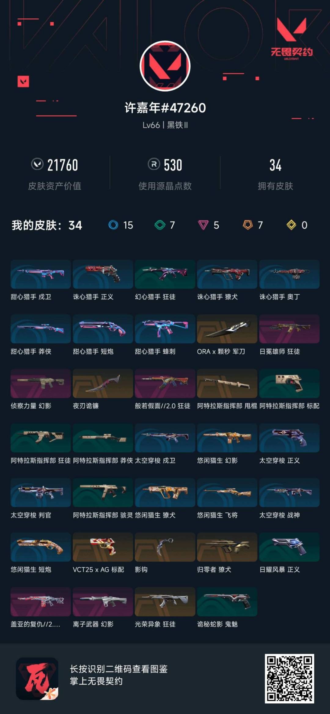 [14590389]7橙皮 5紫皮 34皮肤 19英雄 54卡面 530已用源晶 黑铁段位 【近战武器皮肤】:ax颗秒 军刀夜刃诡镰阿特拉斯指挥部影钩 【佩呛皮肤】:标配-vct25xag 【步呛皮肤】:狂徒-般若假面//2.0狂徒-光荣异象狂徒-日冕雄师幻影-侦察力量幻影-盖亚的复仇2.0幻影-离子武器獠犬-归零者 【挂饰】:双城之战魄罗挂饰神中神挂饰v25第三幕:黑铁 挂饰vctxag挂饰