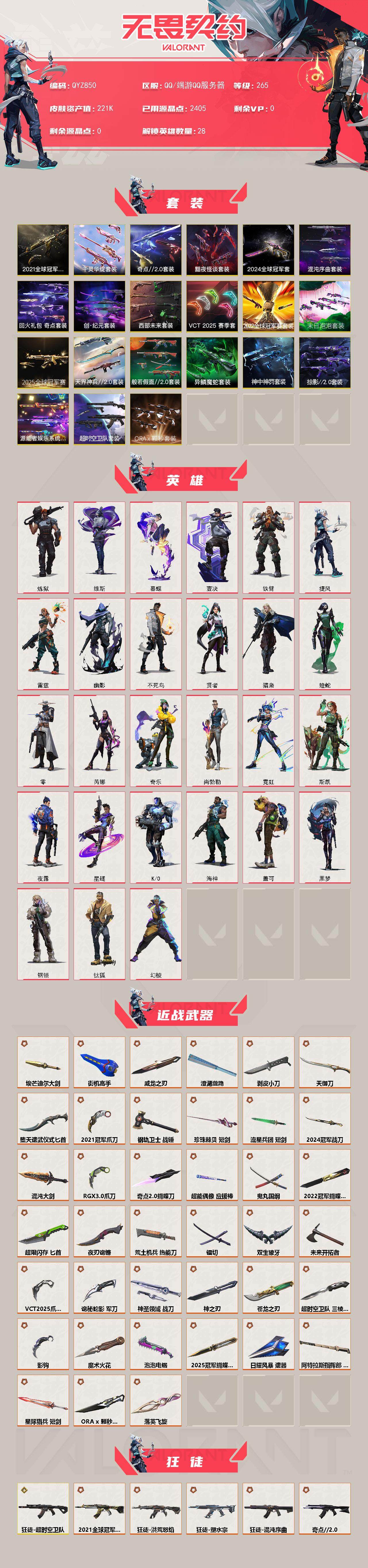 【qyz850】终极83/传奇12/卓越28/皮肤266/等级265/段位:铂金/2025全球冠军赛套装/2024全球冠军赛套装/2022全球冠军赛/2021全球冠军赛/超时空卫队/源能者娱乐系统/a x 颗秒套装/末日泡泡套装/vct 2025 赛季/西部未来/创纪元套装/混沌序曲套装/千灵华绽/奇点//2.0/黯夜怪谈套装/回火礼包:奇点/般若假面//2.0/异鳞魔蛇/天界神