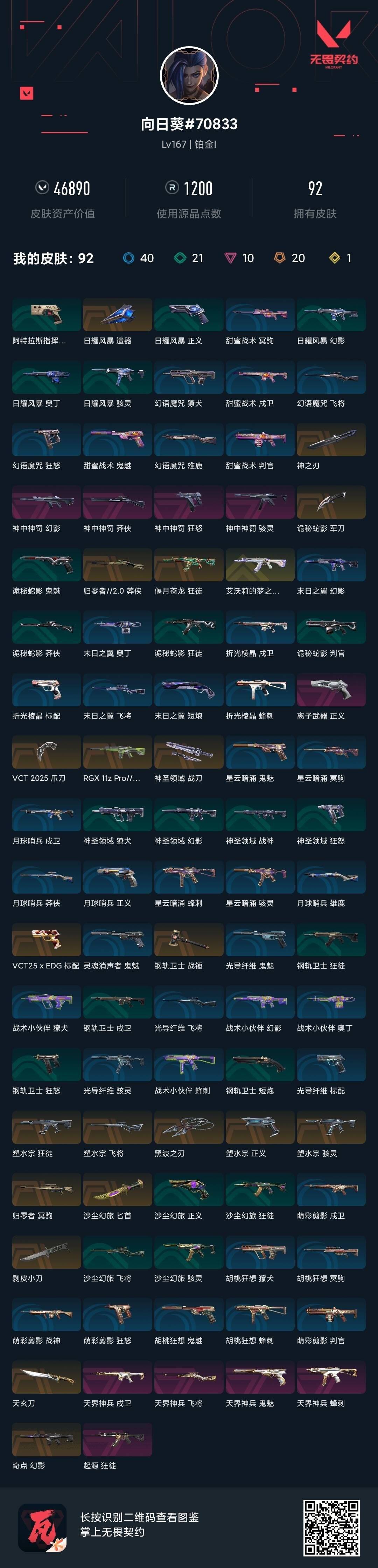 [14591838]20橙皮 1金皮 10紫皮 92皮肤 28英雄 151卡面 1200已用源晶 铂金段位 【套装】:神罚套装神中神罚套装vct 2025赛季礼包vctcn2025套装塑水宗套装天界神兵套装 【近战武器皮肤】:战锤-钢轨卫士神之刃神圣领域 战刀vct 2025 爪刀诡秘蛇影黑波之刃剥皮小刀天玄刀匕首-沙尘幻旅 【佩呛皮肤】:标配-vct25xedg狂怒-神中神罚正义-塑水宗正义-离子武器鬼魅-天界神兵 【冲锋呛皮肤】:骇灵-神中神罚骇灵-塑水宗蜂刺-天界神兵 【步呛皮肤】:幻影-rgx 11z pro//2.0幻影-神中神罚狂徒-塑水宗狂徒-艾沃莉的梦之翼狂徒-起源狂徒-偃月苍龙幻影-奇点戍卫-天界神兵 【狙击呛皮肤】:莽侠-归零者//2.0莽侠-神中神罚飞将-塑水宗冥驹-归零者飞将-天界神兵 【挂饰】:薰衣草之心挂饰袖珍捷风挂饰传世莲华挂饰鱼骨头挂饰双城之战魄罗挂饰神中神罚挂饰神中神挂饰vct2025emea联赛挂饰塑水宗挂饰vct2025太平洋联赛挂饰vct2025美洲联赛挂饰vct2025cn联赛挂饰针织蜜蜂挂饰冬日絮语挂饰蓄势待滚挂饰幸运中国结挂饰高音谱号挂饰vctxedg挂饰