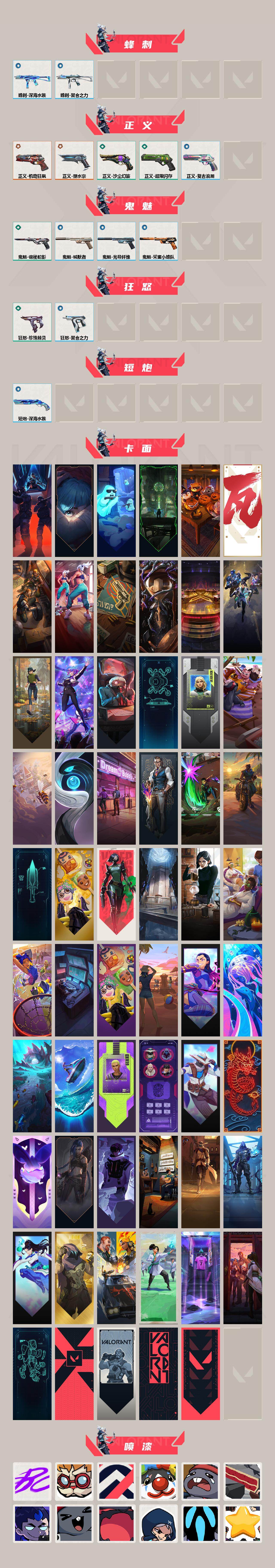 [14593955]【英雄】:幻棱,炼狱,维斯,暮蝶,壹决,铁臂,捷风,雷兹,幽影,不死鸟,贤者,猎枭,零,芮娜,尚勃勒,霓虹,夜露,黑梦,钢锁 【近战 武器】:近战武器-5周年//公测重制版 苍龙之刃,近战武器-光荣异象 歧途,近战武器-威龙之刃,近战武器-夜之蝴蝶,近战武器-珍珠棘贝 短剑,近战武器-神罚 军刀,近战武器-日耀风暴 遗器 【狂徒】:狂徒-冰点凝冻,狂徒-堕天遗武,狂徒-海洋之星,狂徒-离子武器//2.0,狂徒-奇幻朋克//3.0,狂徒-超能偶像 【幻影】:幻影-异彩晶棱,幻影-珍珠棘贝,幻影-聚合之力 【戍卫】:戍卫-超能偶像,戍卫-珍珠棘贝 【獠犬】:獠犬-采蜜小蜂队,獠犬-复古浪潮 【冥驹】:冥驹-万铀引力辐爆者,冥驹-复古浪潮,冥驹-沙场老兵 【飞将】:飞将-聚合之力 【莽侠】:莽侠-深海水族 【战神】:战神-采蜜小蜂队,战神-深海水族 【判官】:判官-光荣异象,判官-超能偶像,判官-采蜜小蜂队 【雄鹿】:雄鹿-复古浪潮 【骇灵】:骇灵-珍珠棘贝,骇灵-无限竞技 【蜂刺】:蜂刺-聚合之力,蜂刺-深海水族 【正义】:正义-机动狂飙,正义-塑水宗,正义-超限闪存,正义-沙尘幻旅,正义-复古浪潮 【鬼魅】:鬼魅-诡秘蛇影,鬼魅-采蜜小蜂队,鬼魅-光导纤维,鬼魅-缄默者 【狂怒】:狂怒-珍珠棘贝,狂怒-聚合之力 【短炮】:短炮-深海水族 【卡面】:纳米打击 卡面,《双城之战》拥抱 卡面,精灵大战 卡面,欢迎来到底城 卡面,南瓜盛典 卡面,vct cn首冠 卡面,修车达人 卡面,热舞环节 卡面,正义的化身 卡面,时间到 卡面,最高舞台 卡面,复活专家 卡面,归乡 // 蝰蛇 卡面,超能偶像 卡面,生意人麦宝 卡面,声感陷阱设计图 卡面,钢锁工牌 卡面,战术小伙伴的夏日 卡面,采蜜小蜂队 卡面,聚合之力 卡面,梦幻奶茶 卡面,无畏契约:尚勃勒 卡面,源能反应 卡面,暂别喧嚣 卡面,零点嗅探设计图 卡面,终章:瓦娃脸雪糕 卡面,无畏契约:蝰蛇 卡面,表象之下 卡面,虹吸式咖啡壶 卡面,源能者美容 卡面,脚踝终结者 卡面 ,夜班 卡面,瓦娃脸雪糕 卡面 ,沙雕爆能器 卡面,无畏契约go!第一卷:芮娜 卡面,深海水族 卡面,珍珠棘贝 卡面,复古浪潮 卡面,盖可工牌 卡面,清除名单 卡面,无畏契约go!第一卷:零 卡面,龍记 卡面,化茧成蝶 卡面,《双城之战》金克丝 卡面,逆向