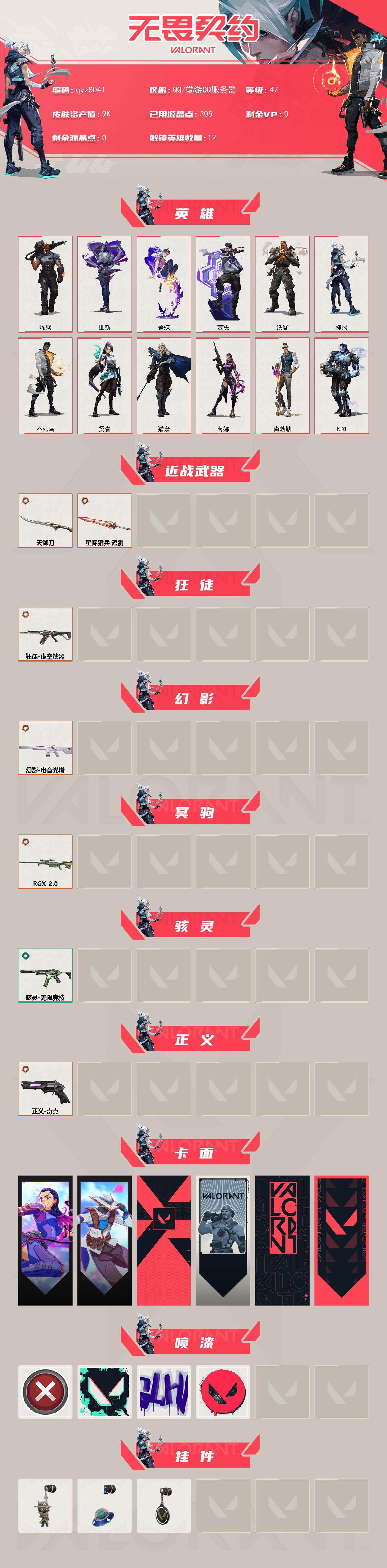 虚空ak-天御刀-奇点正义-qyz8041-近战武器皮肤:-天御刀-步呛皮肤:-狂徒-虚空遗器幻影-电音光谱-佩呛皮肤:-正义-奇点-狙击呛皮肤:-冥驹-rgx-11z-pro//20-亮点:-【qyz8041】【英雄】:炼狱,维斯,暮蝶,壹决,铁臂,捷风,不死鸟,贤者,猎枭,芮娜,尚勃勒,k/o【近战-武器】:近战武器-天御刀,近战武器-星际猎兵-短剑【狂徒】:狂徒-虚空遗器【幻影】:幻影-电音光谱,幻影-电音光谱【冥驹】:冥驹-rgx-11z-pro//20【骇灵】:骇灵-无限竞技【正义】:正义-奇点【卡面】:无畏契约go!第一卷:芮娜-卡面,无畏契约go!第一卷:零-卡面,代号红色-卡面,新兵报到-卡面,v契约-卡面,无畏契约-卡面【喷漆】:买装还是存钱-喷漆,胜利属于无畏契约-喷漆,glhf-喷漆,无畏契约-喷漆【挂饰】:无畏契约go!第一卷-零-挂饰,天外飞客-挂饰,无畏契约-纪念币-挂饰