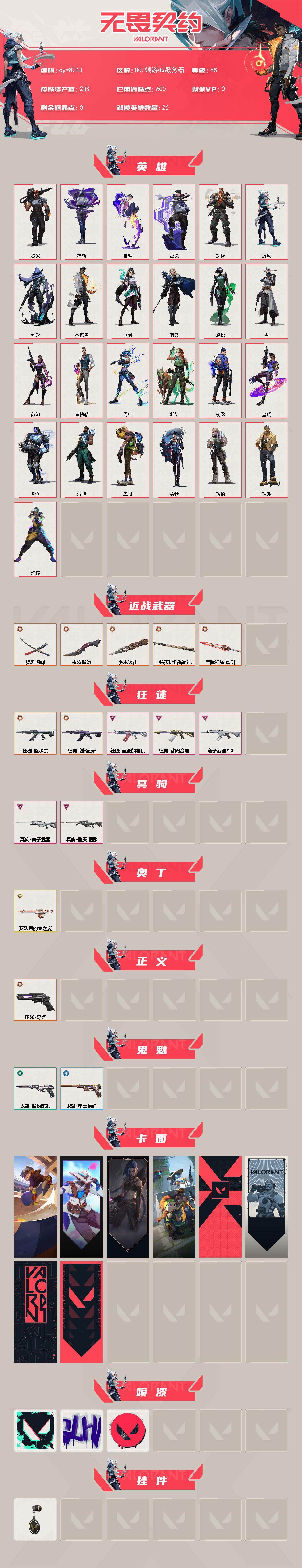 艾沃利奥丁-盖亚紫金离子塑水宗狂徒-堕天离子冥驹-鬼丸国纲魔术火花-qyz8043-近战武器皮肤:-夜刃诡镰鬼丸国纲魔术火花-步呛皮肤:-狂徒-紫阙金琅狂徒-盖亚的复仇狂徒-塑水宗狂徒-创纪元狂徒-离子武器20-佩呛皮肤:-正义-奇点-狙击呛皮肤:-冥驹-堕天遗武冥驹-离子武器-机呛皮肤:-奥丁-艾沃莉的梦之翼-亮点:-【qyz8043】【英雄】:幻棱,炼狱,维斯,暮蝶,钛狐,壹决,铁臂,捷风,幽影,不死鸟,贤者,猎枭,蝰蛇,零,芮娜,尚勃勒,霓虹,斯凯,夜露,星礈,k/o,海神,盖可,黑梦,钢锁【近战-武器】:近战武器-魔术火花,近战武器-鬼丸国纲,近战武器-夜刃诡镰,近战武器-阿特拉斯指挥部-甩棍,近战武器-星际猎兵-短剑,近战武器-魔术火花【狂徒】:狂徒-塑水宗,狂徒-创纪元,狂徒-盖亚的复仇,狂徒-紫阙金琅,狂徒-离子武器//20【冥驹】:冥驹-堕天遗武,冥驹-离子武器【奥丁】:奥丁-艾沃莉的梦之翼【正义】:正义-奇点【鬼魅】:鬼魅-诡秘蛇影,鬼魅-星云暗涌【卡面】:clutch-卡面,无畏契约go!第一卷:零-卡面,《双城之战》金克丝-卡面,别冒尖-卡面,代号红色-卡面,新兵报到-卡面,v契约-卡面,无畏契约-卡面【喷漆】:胜利属于无畏契约-喷漆,glhf-喷漆,无畏契约-喷漆【挂饰】:无畏契约-纪念币-挂饰