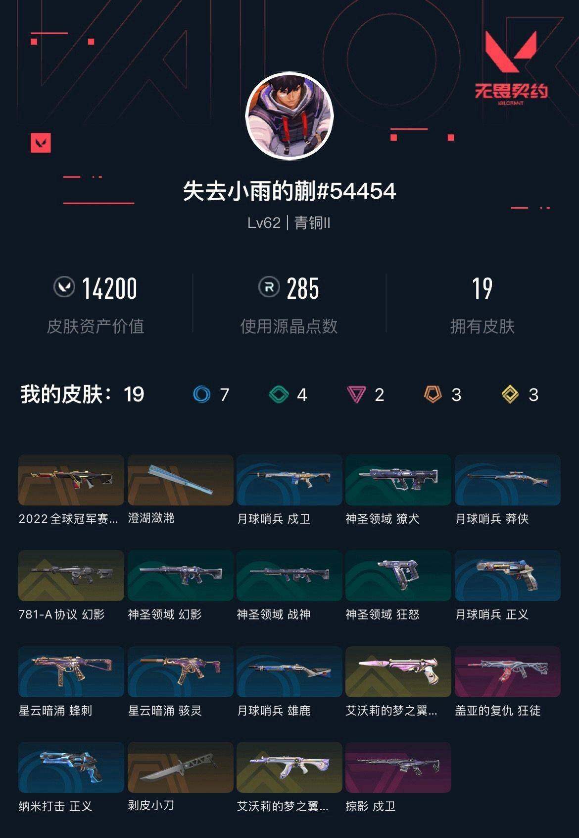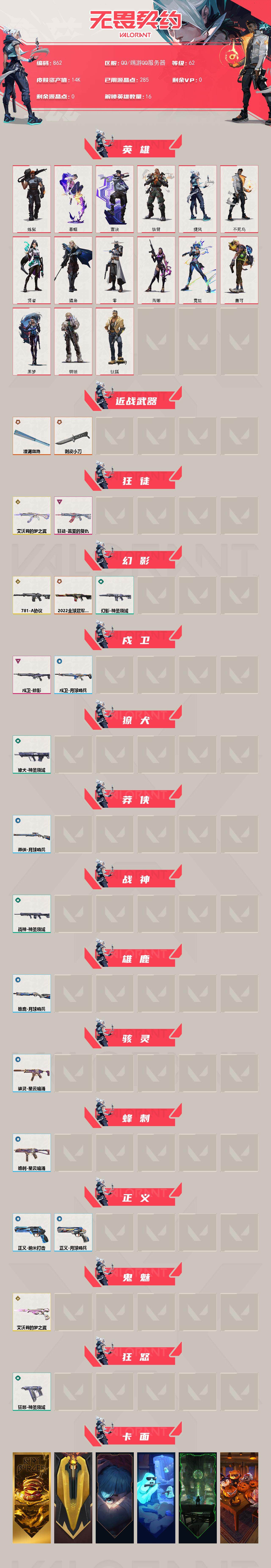 [14611158]【英雄】:炼狱,暮蝶,钛狐,壹决,铁臂,捷风,不死鸟,贤者,猎枭,零,芮娜,霓虹,盖可,黑梦,钢锁 【近战 武器】:近战武器-剥皮小刀,近战武器-澄湖潋滟 【狂徒】:狂徒-艾沃莉的梦之翼,狂徒-盖亚的复仇 【幻影】:幻影-781-a协议,幻影-2022全球冠军赛,幻影-神圣领域 【戍卫】:戍卫-掠影,戍卫-月球哨兵 【獠犬】:獠犬-神圣领域 【莽侠】:莽侠-月球哨兵 【战神】:战神-神圣领域 【雄鹿】:雄鹿-月球哨兵 【骇灵】:骇灵-星云暗涌 【蜂刺】:蜂刺-星云暗涌 【正义】:正义-纳米打击,正义-月球哨兵 【鬼魅】:鬼魅-艾沃莉的梦之翼 【狂怒】:狂怒-神圣领域 【卡面】:终章:激斗汉堡 卡面,进入射程 卡面,《双城之战》拥抱 卡面,精灵大战 卡面,欢迎来到底城 卡面,南瓜盛典 卡面,正义的化身 卡面,无畏契约go!第一卷:零 卡面,代号红色 卡面,新兵报到 卡面,v契约 卡面,无畏契约 卡面 【喷漆】:嗨宝南瓜灯 喷漆,嘭! 喷漆,都算到了 喷漆,控场勿近 喷漆,熊抱 喷漆,买装还是存钱 喷漆,胜利属于无畏契约 喷漆,glhf 喷漆,无畏契约 喷漆 【挂饰】:终章:猫猫木乃伊 挂饰,悠闲鸡块 挂饰,伞绳 挂饰,《双城之战》小蛋糕 挂饰,第九季//第三幕 纪念币 挂饰,无畏契约go!第一卷 芮娜 挂饰,无畏契约go!第一卷 零 挂饰,第九季//第二幕 纪念币 挂饰,z世代特饮 挂饰,天外飞客 挂饰,无畏契约 纪念币 挂饰