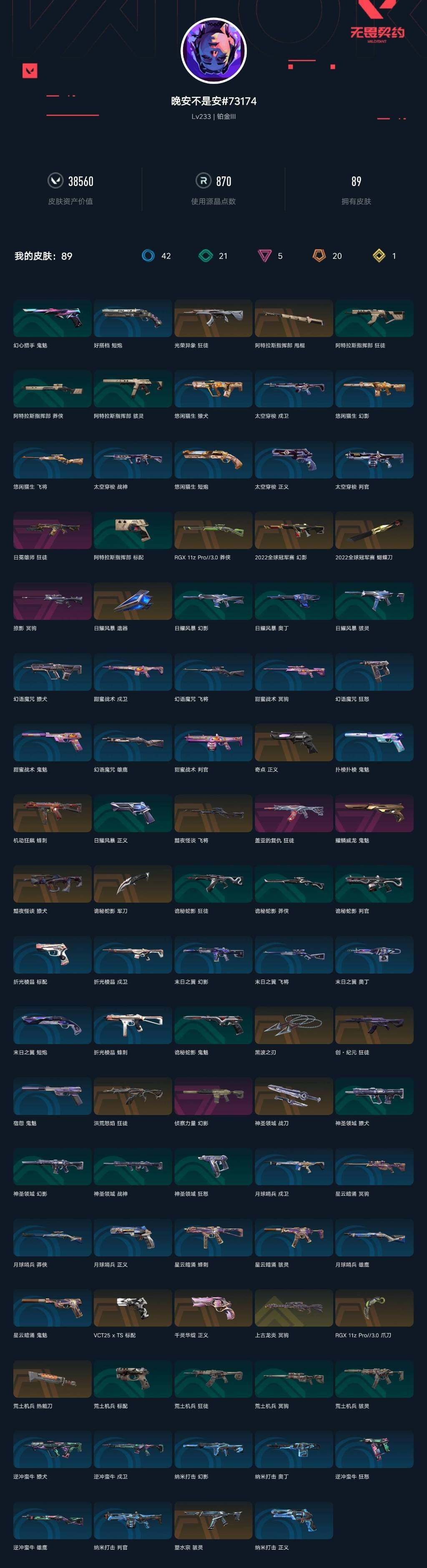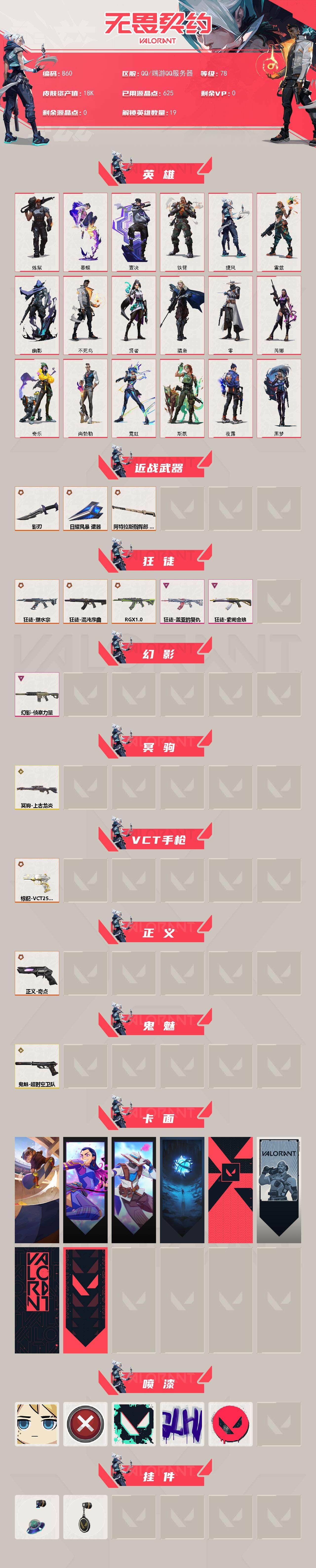 [14611242]【英雄】:炼狱,暮蝶,壹决,铁臂,捷风,雷兹,幽影,不死鸟,贤者,猎枭,零,芮娜,奇乐,尚勃勒,霓虹,斯凯,夜露,黑梦 【近战 武器】:近战武器-影刃,近战武器-日耀风暴 遗器,近战武器-阿特拉斯指挥部 甩棍 【狂徒】:狂徒-混沌序曲,狂徒-塑水宗,狂徒-rgx 11z pro,狂徒-盖亚的复仇,狂徒-紫阙金琅 【幻影】:幻影-侦察力量 【冥驹】:冥驹-上古龙炎 【vct手呛】:标配-vct25 x th 【正义】:正义-奇点 【鬼魅】:鬼魅-超时空卫队 【卡面】:clutch 卡面,无畏契约go!第一卷:芮娜 卡面,无畏契约go!第一卷:零 卡面,无垠星环 卡面,代号红色 卡面,新兵报到 卡面,v契约 卡面,无畏契约 卡面 【喷漆】:当然可以 喷漆,买装还是存钱 喷漆,胜利属于无畏契约 喷漆,glhf 喷漆,无畏契约 喷漆 【挂饰】:天外飞客 挂饰,无畏契约 纪念币 挂饰
