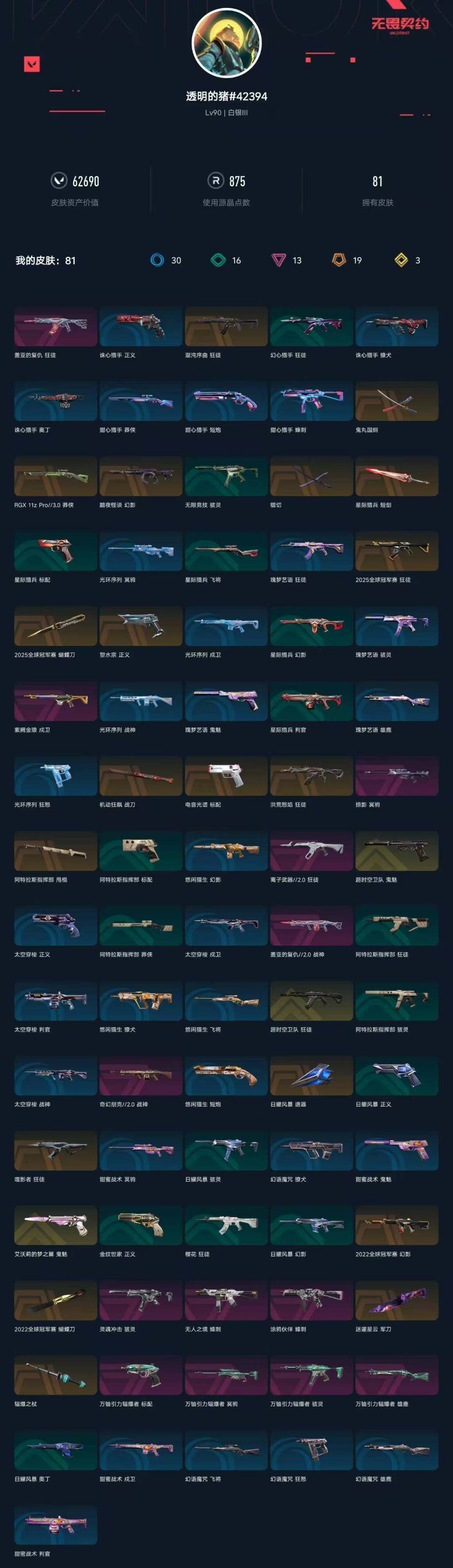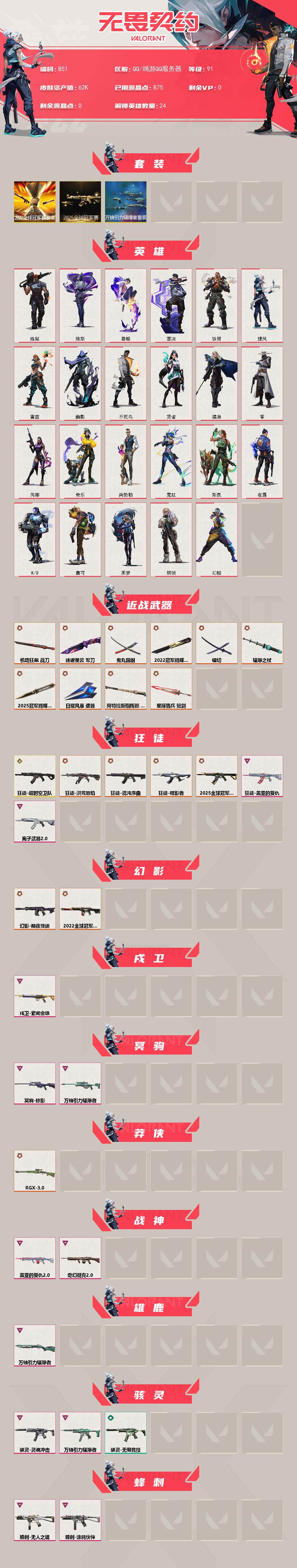 [14611404]【套装】:2025全球冠军赛套装,2022全球冠军赛套装,万铀引力辐爆者套装 【英雄】:幻棱,炼狱,维斯,暮蝶,壹决,铁臂,捷风,雷兹,幽影,不死鸟,贤者,猎枭,零,芮娜,奇乐,尚勃勒,霓虹,斯凯,夜露,k/o,盖可,黑梦,钢锁 【近战 武器】:近战武器-2025全球冠军赛 蝴蝶刀,近战武器-2022全球冠军赛 蝴蝶刀,近战武器-镭切,近战武器-鬼丸国纲,近战武器-辐爆之杖,近战武器-机动狂飙 战刀,近战武器-迷邃星云 军刀,近战武器-日耀风暴 遗器,近战武器-阿特拉斯指挥部 甩棍,近战武器-星际猎兵 短剑 【狂徒】:狂徒-超时空卫队,狂徒-2025全球冠军赛,狂徒-洪荒怒焰,狂徒-混沌序曲,狂徒-噬影者,狂徒-盖亚的复仇,狂徒-离子武器//2.0 【幻影】:幻影-2022全球冠军赛,幻影-黯夜怪谈 【戍卫】:戍卫-紫阙金琅 【冥驹】:冥驹-掠影,冥驹-万铀引力辐爆者 【莽侠】:莽侠-rgx 11z pro//3.0 【战神】:战神-盖亚的复仇//2.0,战神-奇幻朋克//2.0 【雄鹿】:雄鹿-万铀引力辐爆者 【骇灵】:骇灵-灵魂冲击,骇灵-万铀引力辐爆者,骇灵-无限竞技 【蜂刺】:蜂刺-涂鸦伙伴,蜂刺-无人之境 【标配】:标配-电音光谱,标配-万铀引力辐爆者,标配-电音光谱 【正义】:正义-塑水宗,正义-金纹世家 【鬼魅】:鬼魅-艾沃莉的梦之翼,鬼魅-超时空卫队 【卡面】:代号红色 卡面,新兵报到 卡面,v契约 卡面,无畏契约 卡面 【喷漆】:霓光四射 喷漆,买装还是存钱 喷漆,胜利属于无畏契约 喷漆,glhf 喷漆,无畏契约 喷漆 【挂饰】:无畏契约 纪念币 挂饰