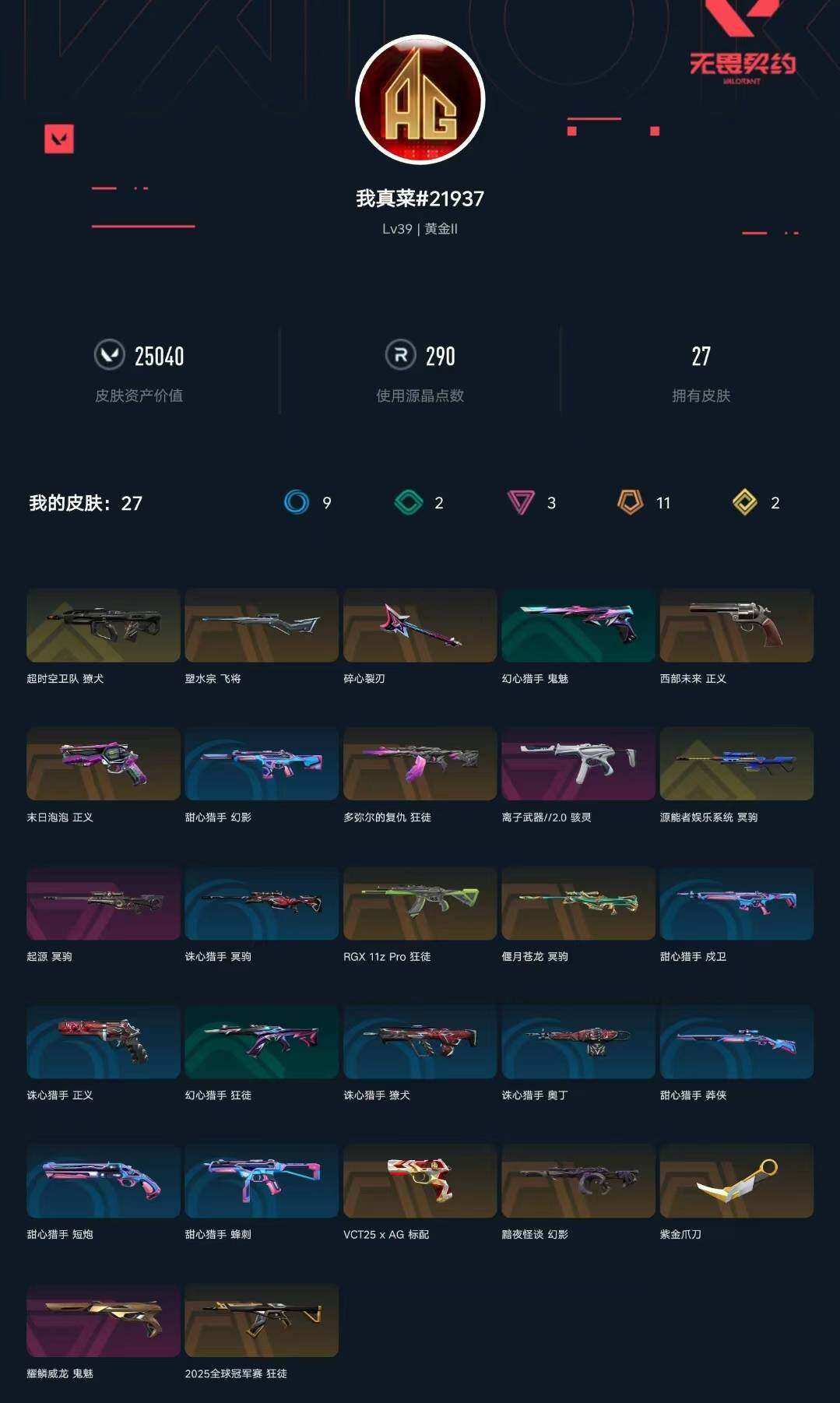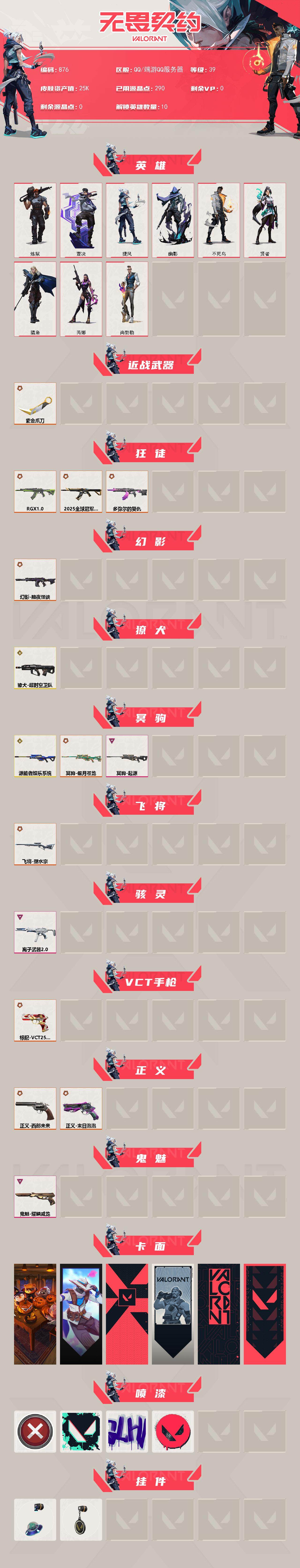[14611479]【英雄】:炼狱,壹决,捷风,幽影,不死鸟,贤者,猎枭,芮娜,尚勃勒 【近战 武器】:近战武器-紫金爪刀 【狂徒】:狂徒-2025全球冠军赛,狂徒-rgx 11z pro,狂徒-多弥尔的复仇 【幻影】:幻影-黯夜怪谈 【獠犬】:獠犬-超时空卫队 【冥驹】:冥驹-源能者娱乐系统,冥驹-偃月苍龙,冥驹-起源 【飞将】:飞将-塑水宗 【骇灵】:骇灵-离子武器//2.0 【vct手呛】:标配-vct25 x ag 【正义】:正义-西部未来,正义-末日泡泡 【鬼魅】:鬼魅-耀鳞威龙 【卡面】:南瓜盛典 卡面,无畏契约go!第一卷:零 卡面,代号红色 卡面,新兵报到 卡面,v契约 卡面,无畏契约 卡面 【喷漆】:买装还是存钱 喷漆,胜利属于无畏契约 喷漆,glhf 喷漆,无畏契约 喷漆 【挂饰】:天外飞客 挂饰,无畏契约 纪念币 挂饰
