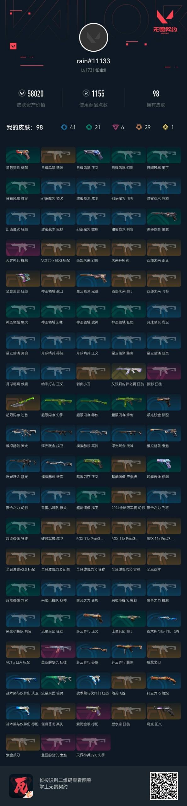[14616839]29橙皮 1金皮 6紫皮 98皮肤 27英雄 126卡面 1155已用源晶 铂金段位 【亮点皮肤】:幻影-2024全球冠军赛 【套装】:西部未来rgx 11z pro//3.0套装全息波普//2.0套装 【近战武器皮肤】:神圣领域 战刀未来开拓者匕首-超限闪存剥皮小刀紫金爪刀威龙之刃爪刀-rgx 11z pro 3.0超能偶像 应援棒全息战斧落英飞旋 【佩呛皮肤】:标配-vct25xedg正义-西部未来正义-奇点正义-rgx 11z pro 3.0鬼魅-盖亚的复仇狂怒-全息波普标配-全息波普//2.0标配-紫阙金琅标配-vctxlev 【冲锋呛皮肤】:蜂刺-天界神兵 【步呛皮肤】:狂徒-掠影幻影-西部未来狂徒-艾沃莉的梦之翼狂徒-盖亚的复仇狂徒-塑水宗狂徒-全息波普//2.0幻影-天界神兵2.0幻影-全息波普//2.0戍卫-破败军械 【狙击呛皮肤】:飞将-西部未来冥驹-偃月苍龙莽侠-rgx 11z pro 3.0冥驹-全息波普//2.0 【机呛皮肤】:奥丁-西部未来 【挂饰】:超能偶像挂饰日冕雄狮挂饰西部未来挂饰袖珍捷风挂饰鱼骨头挂饰双城之战小蛋糕挂饰双城之战魄罗挂饰神中神挂饰rgx11zpro3.0挂饰双面黑猫挂饰vctxlev挂饰糖葫芦挂饰云开见日挂饰迷你机甲挂饰vctxedg挂饰终章ko小金人挂饰