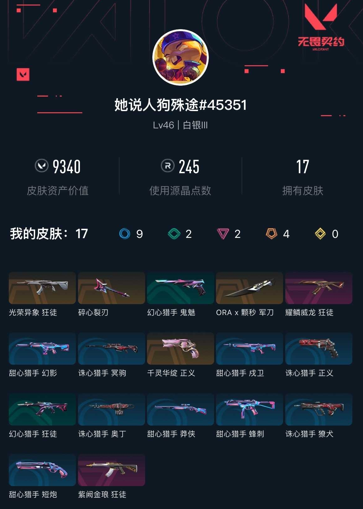 【无畏契约】【yhwww7176】等级:46,已用无畏点9340,已用源晶点245,橙皮:正义-千灵华绽|狂徒-光荣异象|近战-a x 颗秒 军刀__紫皮:狂徒-耀鳞威龙|狂徒-紫阙金琅__段位:白银__英雄:尚勃勒|黑梦|暮蝶|盖可|壹决|钢锁|炼狱|铁臂|贤者|猎枭|芮娜|捷风|不死鸟|幻棱__蓝皮:蜂刺-甜心猎手|短炮-甜心猎手|莽侠-甜心猎手|幻影-甜心猎手|戍卫-甜心猎手|正义-诛心猎手|冥驹-诛心猎手|獠犬-诛心猎手|奥丁-诛心猎手__绿皮:狂徒-幻心猎手|鬼魅-幻心猎手
