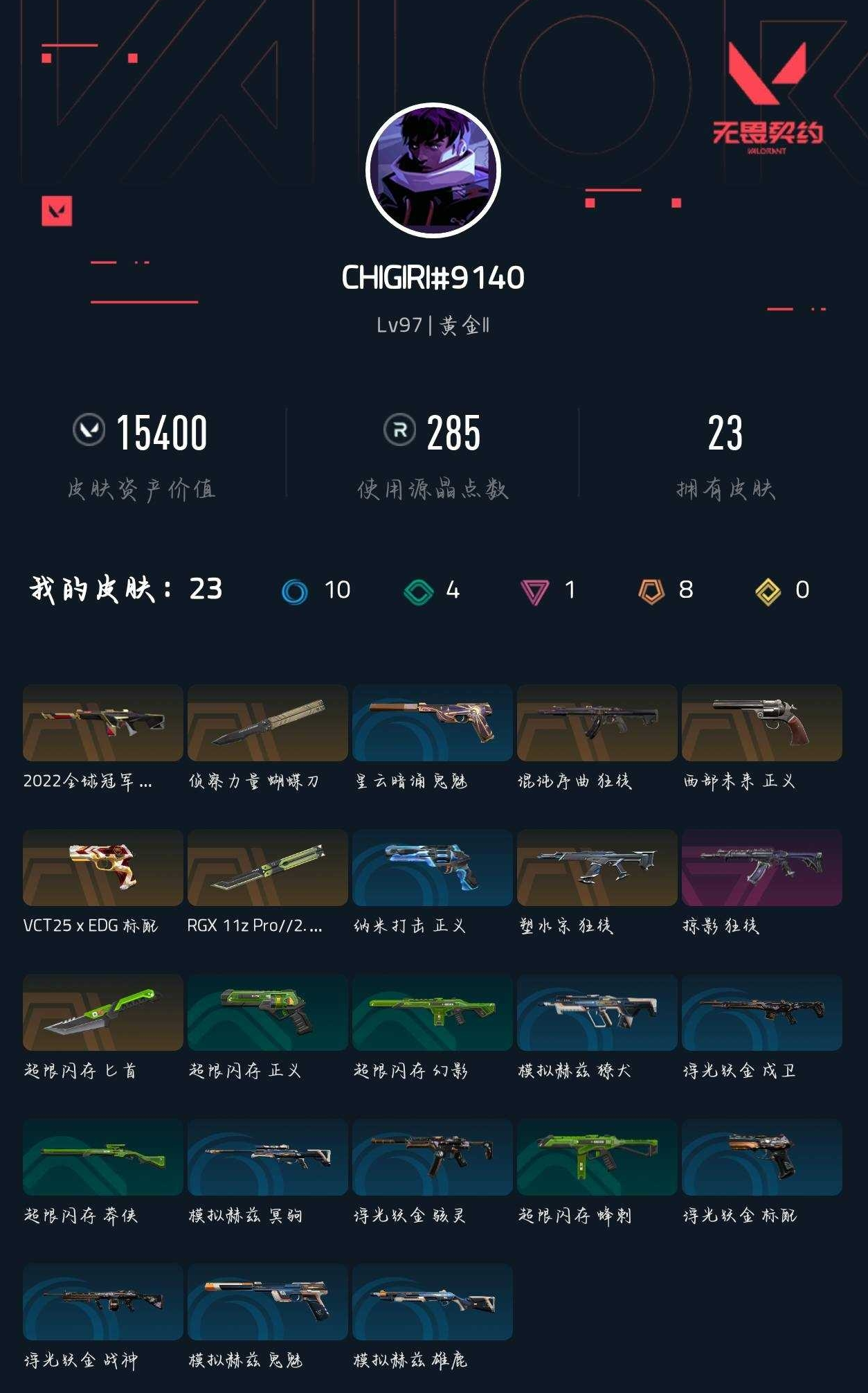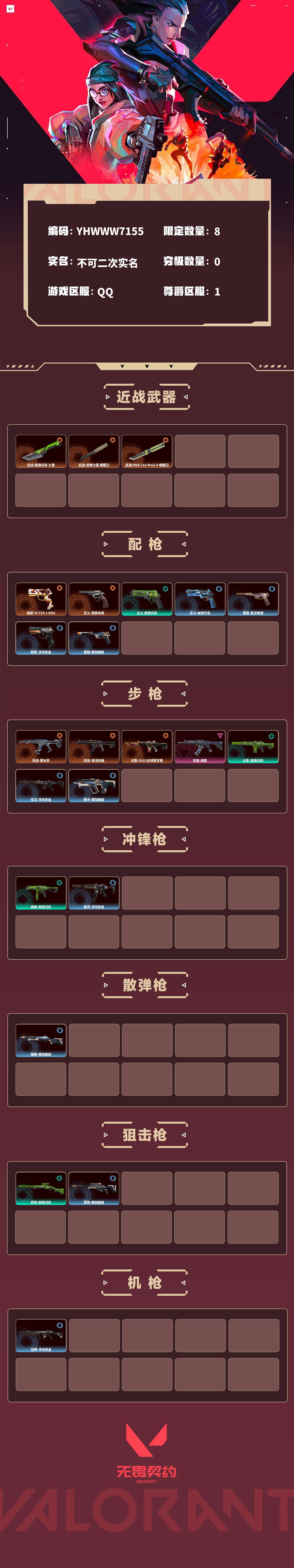 【无畏契约】【yhwww7155】等级:97,已用无畏点15400,已用源晶点285,橙皮:近战-超限闪存 匕首|狂徒-塑水宗|狂徒-混沌序曲|近战-侦察力量 蝴蝶刀|标配-vct25 x edg|近战-rgx 11z pro2.0 蝴蝶刀|正义-西部未来|幻影-2022全球冠军赛__段位:黄金__紫皮:狂徒-掠影__蓝皮:正义-纳米打击|鬼魅-星云暗涌|骇灵-浮光跃金|标配-浮光跃金|戍卫-浮光跃金|战神-浮光跃金|鬼魅-模拟赫兹|獠犬-模拟赫兹|冥驹-模拟赫兹|雄鹿-模拟赫兹__绿皮:正义-超限闪存|莽侠-超限闪存|幻影-超限闪存|蜂刺-超限闪存__英雄:维斯|黑梦|暮蝶|盖可|霓虹|壹决|星礈|k/o|钢锁|奇乐|炼狱|贤者|猎枭|钛狐|芮娜|零|捷风|不死鸟|幻棱|雷兹库存15400/显卡蝴蝶刀/侦查蝴蝶/22幻影/多狂徒/全单品热门皮/剩余r点:225