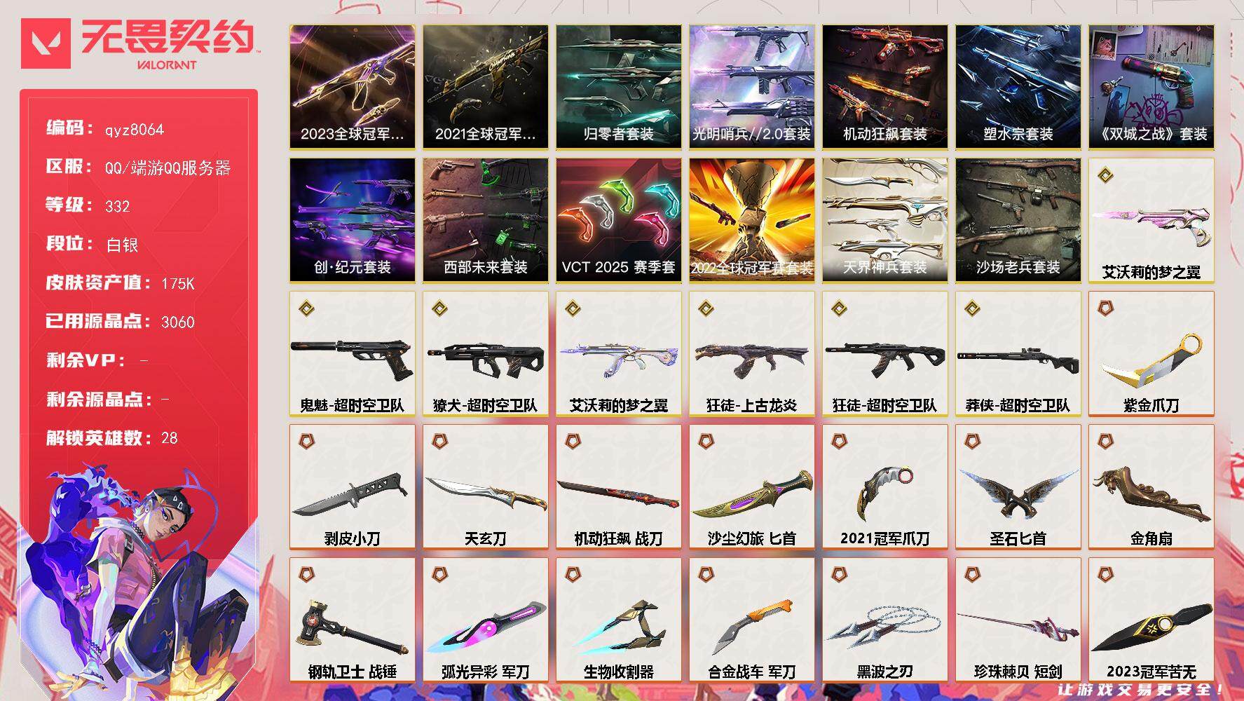 【qyz8064】【套装】:2023全球冠军赛套装,2022全球冠军赛套装,2021全球冠军赛套装,超时空卫队套装,a-x-颗秒套装,vct-2025-赛季套装,西部未来套装,创纪元套装,塑水宗套装,《英雄联盟:双城之战》套装,光明哨兵//20套装,归零者套装,机动狂飙套装,天界神兵套装,沙场老兵套装-【英雄】:幻棱,炼狱,维斯,暮蝶,钛狐,壹决,铁臂,捷风,雷兹,幽影,不死鸟,贤者,猎枭,蝰蛇,零,芮娜,奇乐,尚勃勒,霓虹,斯凯,夜露,星礈,k/o,海神,盖可,黑梦,钢锁-【近战-武器】:近战武器-2023全球冠军赛-苦无,近战武器-2022全球冠军赛-蝴蝶刀,近战武器-2021全球冠军赛-爪刀,近战武器-a-x-颗秒-军刀,近战武器-超时空卫队-三棱军刺,近战武器-5周年//公测重制版-苍龙之刃,近战武器-剥皮小刀,近战武器-vct-2025-爪刀,近战武器-紫金爪刀,近战武器-rgx-11z-pro//30-爪刀,近战武器-黑波之刃,近战武器-镭切,近战武器-未来开拓者,近战武器-珍珠棘贝-短剑,近战武器-超限闪存-匕首,近战武器-钢轨卫士-战锤,近战武器-合金战车-军刀,近战武器-弧光异彩-军刀,近战武器-荒土机兵-热能刀,近战武器-机动狂飙-战刀,近战武器-金角扇,近战武器-沙尘幻旅-匕首,近战武器-生物收割器,近战武器-圣石匕首,近战武器-天玄刀,近战武器-诡秘蛇影-军刀,近战武器-神圣领域-战刀,近战武器-日耀风暴-遗器,近战武器-阿特拉斯指挥部-甩棍-【狂徒】:狂徒-艾沃莉的梦之翼,狂徒-上古龙炎,狂徒-超时空卫队,狂徒-2023全球冠军赛,狂徒-2021全球冠军赛,狂徒-归零者,狂徒-机动狂飙,狂徒-塑水宗,狂徒-创纪元,狂徒-噬影者,狂徒-rgx-11z-pro,狂徒-a-x-颗秒,狂徒-冰点凝冻,狂徒-堕天遗武,狂徒-掠影,狂徒-盖亚的复仇,狂徒-海洋之星,狂徒-日冕雄师,狂徒-耀鳞威龙,狂徒-紫阙金琅,狂徒-离子武器//20,狂徒-钢轨卫士,狂徒-弧光异彩,狂徒-荒土机兵,狂徒-沙尘幻旅,狂徒-诡秘蛇影-【幻影】:幻影-2022全球冠军赛,幻影-光明哨兵//20,幻影-洪荒怒焰,幻影-砰砰x特攻队,幻影-西部未来,幻影-a-x-颗秒,幻影-离子武器,幻影-天界神兵//20,幻影-侦察力量,幻影-海洋之星//2