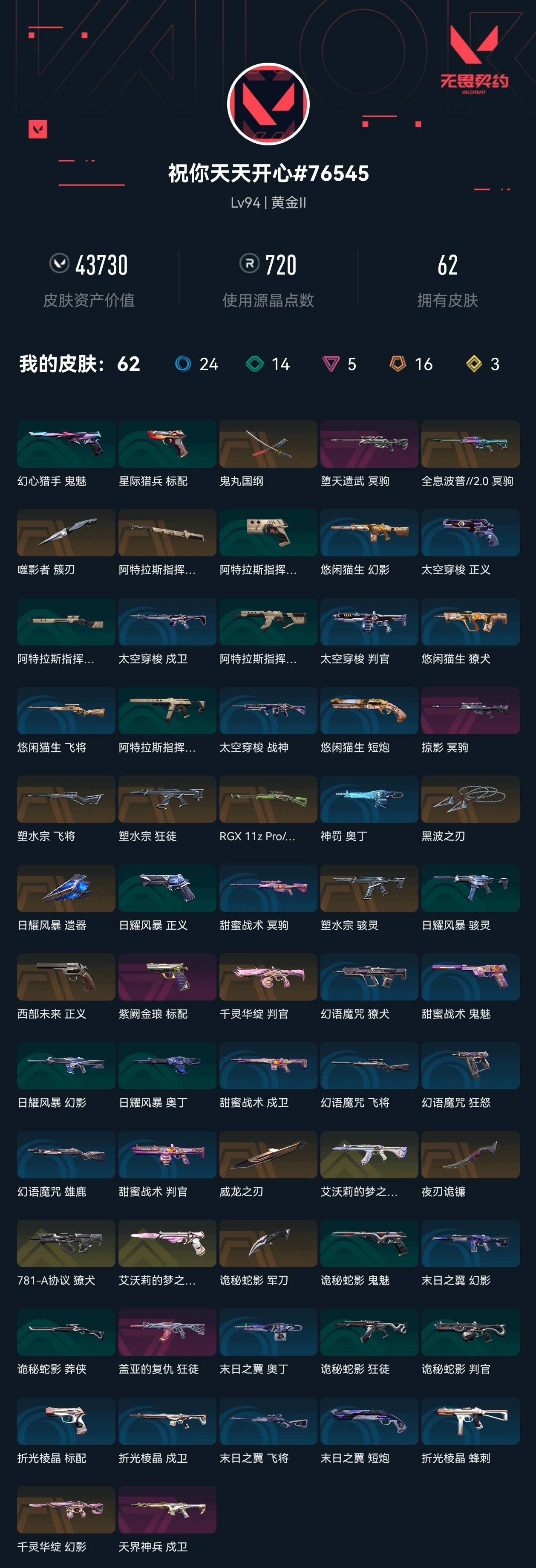【无畏契约】【yhwww7160】等级:94,已用无畏点43730,已用源晶点720,金皮:獠犬-781-a协议|狂徒-艾沃莉的梦之翼|鬼魅-艾沃莉的梦之翼__橙皮:飞将-塑水宗|幻影-千灵华绽|骇灵-塑水宗|近战-黑波之刃|近战-威龙之刃|近战-夜刃诡镰|莽侠-rgx 11z pro3.0|狂徒-塑水宗|判官-千灵华绽|冥驹-全息波普2.0|近战-鬼丸国纲|正义-西部未来|近战-诡秘蛇影 军刀|近战-噬影者 簇刃|近战-日耀风暴 遗器|近战-阿特拉斯指挥部 甩棍__紫皮:标配-紫阙金琅|狂徒-盖亚的复仇|冥驹-堕天遗武|戍卫-天界神兵|冥驹-掠影__段位:黄金__蓝皮:奥丁-神罚|蜂刺-折光棱晶|戍卫-折光棱晶|标配-折光棱晶|飞将-末日之翼|幻影-末日之翼|短炮-末日之翼|奥丁-末日之翼|鬼魅-甜蜜战术|判官-甜蜜战术|戍卫-甜蜜战术|雄鹿-幻语魔咒|獠犬-幻语魔咒|飞将-幻语魔咒|狂怒-幻语魔咒|正义-太空穿梭|战神-太空穿梭|判官-太空穿梭|戍卫-太空穿梭|骇灵-阿特拉斯指挥部|莽侠-阿特拉斯指挥部|标配-阿特拉斯指挥部|狂徒-阿特拉斯指挥部__绿皮:判官-诡秘蛇影|鬼魅-诡秘蛇影|莽侠-诡秘蛇影|狂徒-诡秘蛇影|正义-日耀风暴|幻影-日耀风暴|奥丁-日耀风暴|短炮-悠闲猫生|飞将-悠闲猫生|幻影-悠闲猫生|獠犬-悠闲猫生|标配-星际猎兵|鬼魅-幻心猎手__英雄:尚勃勒|黑梦|暮蝶|盖可|壹决|k/o|幽影|夜露|奇乐|炼狱|铁臂|贤者|猎枭|芮娜|零|捷风|蝰蛇|不死鸟