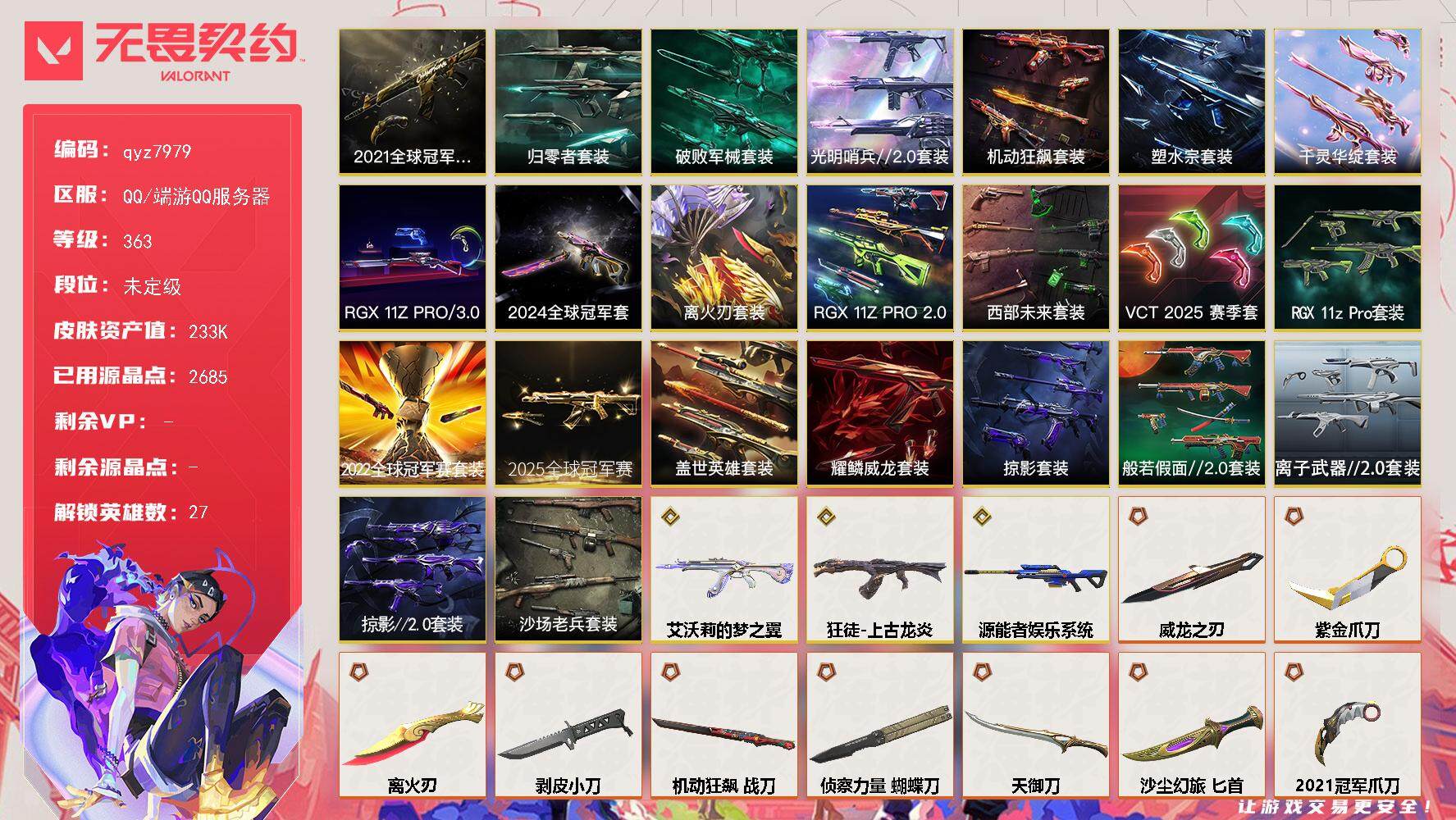 21-22-24-25-vp23万-qyz7979-亮点皮肤:-离火刃狂徒-2021全球冠军赛爪刀-2021全球冠军赛幻影-2024全球冠军赛战刀-2024全球冠军赛幻影-2022全球冠军赛蝴蝶刀-2022全球冠军赛-套装:-2021全球冠军赛套装2024全球冠军赛套装归零者套装盖世英雄套装光明哨兵//20套装机动狂飙套装破败军械套装塑水宗套装耀鳞威龙套装千灵华绽套装rgx-11z-pro//30套装掠影套装般若假面//20套装rgx-11z-pro//20西部未来vct-2025赛季礼包离子武器20rgx-11z-pro套装2022全球冠军赛掠影20套装2025全球冠军赛-近战武器皮肤:-军刀-合金战车军刀-弧光异彩蝴蝶刀-侦察力量生物收割器匕首-沙尘幻旅定海神珍剥皮小刀圣石匕首机动狂飙战刀紫金爪刀破败王者之残刃黑波之刃威龙之刃短剑-珍珠棘贝天御刀落英飞旋超能偶像-应援棒爪刀-rgx-11z-pro-30短剑-流星兵团战锤-钢轨卫士匕首-超限闪存影刃荒土机兵热能刀鬼丸国纲神圣领域-战刀rgx-11z-pro//20-蝴蝶刀未来开拓者vct-2025-爪刀离子武器20-爪刀诡秘蛇影rgx-11z-pro-战刀苍龙之刃影钩魔术火花2025全球冠军赛-蝴蝶刀-步呛皮肤:-狂徒-紫阙金琅戍卫-盖亚的复仇狂徒-盖亚的复仇狂徒-偃月苍龙幻影-侦察力量狂徒-冰点凝冻獠犬-归零者狂徒-归零者戍卫-天界神兵狂徒-盖世英雄幻影-光明哨兵20狂徒-机动狂飙戍卫-破败军械幻影-破败军械狂徒-塑水宗狂徒-耀鳞威龙狂徒-堕天遗武幻影-洪荒怒焰狂徒-洪荒怒焰幻影-天界神兵20幻影-千灵华绽狂徒-海洋之星狂徒-日冕雄师狂徒-艾沃莉的梦之翼狂徒-全息波普//20狂徒-混沌序曲狂徒-掠影戍卫-掠影狂徒-双城之战狂徒-般若假面//20獠犬-般若假面//20狂徒-上古龙炎幻影-rgx-11z-pro//20幻影-西部未来狂徒-离子武器20戍卫-rgx-11z-pro狂徒-rgx-11z-pro狂徒-光荣异象幻影-掠影20幻影-奇幻朋克30奇幻朋克30