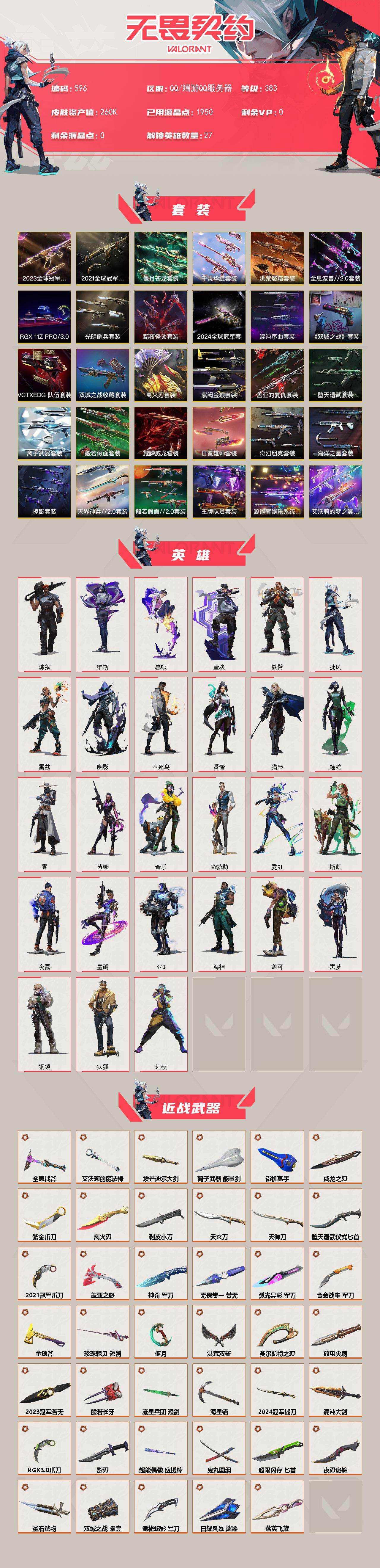 [14603741]【套装】:2024全球冠军赛套装,2023全球冠军赛套装,2021全球冠军赛套装,源能者娱乐系统套装,艾沃莉的梦之翼套装,rgx 11z pro//3.0套装,混沌序曲套装,离火刃套装,《英雄联盟:双城之战》套装,《双城之战》收藏套装,千灵华绽套装,光明哨兵套装,黯夜怪谈套装,洪荒怒焰套装,全息波普//2.0套装,偃月苍龙套装,vctxedg 队伍套装,般若假面//2.0套装,掠影套装,耀鳞威龙套装,紫阙金琅套装,离子武器套装,般若假面套装,天界神兵//2.0套装,奇幻朋克套装,堕天遗武套装,盖亚的复仇套装,海洋之星套装,日冕雄师套装,王牌队员套装,离火刃套装 【英雄】:幻棱,炼狱,维斯,暮蝶,钛狐,壹决,铁臂,捷风,雷兹,幽影,不死鸟,贤者,猎枭,蝰蛇,零,芮娜,奇乐,尚勃勒,霓虹,斯凯,夜露,星礈,k/o,海神,盖可,黑梦,钢锁 【近战 武器】:近战武器-2024全球冠军赛 战刀,近战武器-2023全球冠军赛 苦无,近战武器-2021全球冠军赛 爪刀,近战武器-无畏契约go!第一卷 苦无,近战武器-剥皮小刀,近战武器-紫金爪刀,近战武器-rgx 11z pro//3.0 爪刀,近战武器-离火刃,近战武器-落英飞旋,近战武器-艾沃莉的魔法棒,近战武器-威龙之刃,近战武器-鬼丸国纲,近战武器-双城之战 拳套,近战武器-埃芒迪尔大剑,近战武器-离子武器 能量剑,近战武器-珍珠棘贝 短剑,近战武器-混沌大剑,近战武器-般若长牙,近战武器-流星兵团 短剑,近战武器-超能偶像 应援棒,近战武器-超限闪存 匕首,近战武器-堕天遗武 仪式匕首,近战武器-放电尖刺,近战武器-盖亚之怒,近战武器-海星锚,近战武器-合金战车 军刀,近战武器-洪荒双斩,近战武器-弧光异彩 军刀,近战武器-街机高手,近战武器-金琅斧,近战武器-全息战斧,近战武器-赛尔凯特之刃,近战武器-神罚 军刀,近战武器-圣石遗物,近战武器-天玄刀,近战武器-天御刀,近战武器-偃月,近战武器-夜刃诡镰,近战武器-影刃,近战武器-诡秘蛇影 军刀,近战武器-日耀风暴 遗器 【狂徒】:狂徒-艾沃莉的梦之翼,狂徒-2023全球冠军赛,狂徒-2021全球冠军赛,狂徒-光明哨兵,狂徒-归零者,狂徒-洪荒怒焰,狂徒-混沌序曲,狂徒-机动狂飙,狂徒-全息波普//2.0,狂徒-双城之战,狂徒-塑水宗,狂徒-偃月苍龙,狂徒-般若假面/