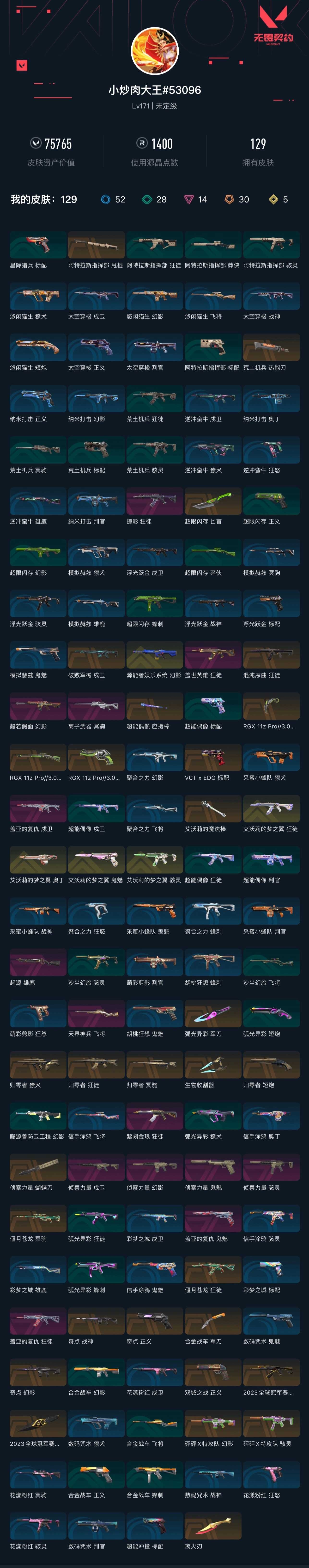 【无畏契约】【yhwww7161】等级:171,已用无畏点75765,已用源晶点1400,金皮:奥丁-艾沃莉的梦之翼|狂徒-艾沃莉的梦之翼|鬼魅-艾沃莉的梦之翼|幻影-源能者娱乐系统|骇灵-艾沃莉的梦之翼__橙皮:标配-vct x edg|骇灵-砰砰x特攻队|短炮-归零者|幻影-砰砰x特攻队|近战-2023全球冠军赛 苦无|幻影-奇点|近战-rgx 11z pro3.0 爪刀|近战-艾沃莉的魔法棒|近战-超限闪存 匕首|近战-弧光异彩 军刀|近战-超能偶像 应援棒|近战-离火刃|近战-生物收割器|莽侠-rgx 11z pro3.0|狂徒-归零者|狂徒-偃月苍龙|獠犬-归零者|狂徒-混沌序曲|狂徒-2023全球冠军赛|正义-奇点|戍卫-破败军械|正义-rgx 11z pro3.0|正义-双城之战|冥驹-归零者|战神-奇点|冥驹-偃月苍龙|近战-侦察力量 蝴蝶刀|近战-合金战车 军刀|近战-荒土机兵 热能刀|近战-阿特拉斯指挥部 甩棍__紫皮:飞将-天界神兵|鬼魅-盖亚的复仇|骇灵-侦察力量|鬼魅-侦察力量|幻影-般若假面|狂徒-盖世英雄|幻影-侦察力量|狂徒-盖亚的复仇|冥驹-离子武器|狂徒-紫阙金琅|戍卫-盖亚的复仇|戍卫-侦察力量|雄鹿-起源|狂徒-掠影__段位:未定级__蓝皮:标配-超能冲撞|狂怒-花漾粉红|骇灵-花漾粉红|戍卫-花漾粉红|冥驹-花漾粉红|战神-数码咒术|獠犬-数码咒术|判官-数码咒术|鬼魅-数码咒术|判官-纳米打击|正义-纳米打击|奥丁-纳米打击|幻影-纳米打击|雄鹿-逆冲蛮牛|狂怒-逆冲蛮牛|戍卫-逆冲蛮牛|獠犬-逆冲蛮牛|鬼魅-采蜜小蜂队|战神-采蜜小蜂队|獠犬-采蜜小蜂队|判官-采蜜小蜂队|戍卫-彩梦之城|雄鹿-彩梦之城|标配-彩梦之城|骇灵-浮光跃金|标配-浮光跃金|戍卫-浮光跃金|战神-浮光跃金|鬼魅-胡桃狂想|蜂刺-胡桃狂想|蜂刺-聚合之力|幻影-聚合之力|狂怒-聚合之力|飞将-聚合之力|狂怒-萌彩剪影|判官-萌彩剪影|鬼魅-模拟赫兹|獠犬-模拟赫兹|冥驹-模拟赫兹|雄鹿-模拟赫兹|鬼魅-信手涂鸦|骇灵-信手涂鸦|奥丁-信手涂鸦|飞将-信手涂鸦|正义-太空穿梭|战神-太空穿梭|判官-太空穿梭|戍卫-太空穿梭|骇灵-阿特拉斯指挥部|莽侠-阿特拉斯指挥部|标配-阿特拉斯指挥部|狂徒-阿特拉斯指挥部__绿皮:蜂刺-合金战车|正义-合金战车|幻影-合金战车|飞将-合金战车|狂徒-荒土机兵|标配-荒土机兵|骇灵-荒土机兵|冥驹-荒土机兵|戍卫-超能偶像|标配-超能偶像|狂徒-超能偶像|判官-超能偶像|正义-超限闪存|莽侠-超限闪存|幻影-超限闪存|蜂刺-超限闪存|短炮-弧光异彩|獠犬-弧光异彩|蜂刺-弧光异彩|狂徒-弧光异彩|飞将-沙尘幻旅|骇灵-沙尘幻旅|幻影-噬源兽防卫工程|短炮-悠闲猫生|飞将-悠闲猫生|幻影-悠闲猫生|獠犬-悠闲猫生|标配-星际猎兵__英雄:尚勃勒|维斯|黑梦|斯凯|暮蝶|盖可|霓虹|壹决|星礈|k/o|幽影|夜露|钢锁|海神|奇乐|炼狱|铁臂|贤者|猎枭|钛狐|芮娜|零|捷风|蝰蛇|不死鸟|幻棱|雷兹