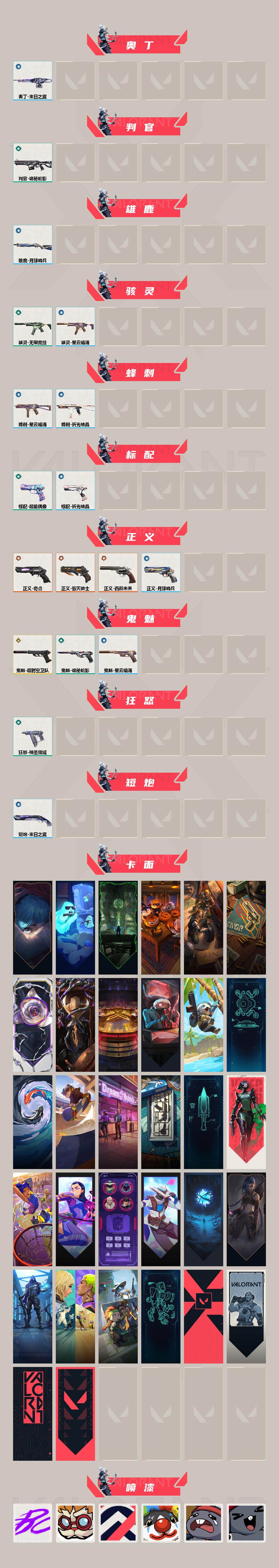 [14656772]【套装】:vct 2025 赛季套装 【英雄】:幻棱,炼狱,维斯,暮蝶,钛狐,壹决,铁臂,捷风,雷兹,幽影,不死鸟,贤者,猎枭,蝰蛇,零,芮娜,奇乐,尚勃勒,霓虹,斯凯,夜露,星礈,k/o,海神,盖可,黑梦,钢锁 【近战 武器】:近战武器-剥皮小刀,近战武器-vct 2025 爪刀,近战武器-黑波之刃,近战武器-诡秘蛇影 军刀,近战武器-神圣领域 战刀,近战武器-日耀风暴 遗器,近战武器-星际猎兵 短剑 【狂徒】:狂徒-洪荒怒焰,狂徒-混沌序曲,狂徒-全息波普//2.0,狂徒-虚空遗器,狂徒-多弥尔的复仇,狂徒-盖亚的复仇,狂徒-日冕雄师,狂徒-诡秘蛇影 【幻影】:幻影-781-a协议,幻影-离子武器,幻影-天界神兵//2.0,幻影-侦察力量,幻影-神圣领域,幻影-末日之翼 【戍卫】:戍卫-天界神兵,戍卫-月球哨兵,戍卫-折光棱晶 【獠犬】:獠犬-混沌序曲//2.0,獠犬-神圣领域 【冥驹】:冥驹-上古龙炎,冥驹-堕天遗武,冥驹-星云暗涌 【飞将】:飞将-末日之翼 【莽侠】:莽侠-诡秘蛇影,莽侠-月球哨兵 【战神】:战神-神圣领域 【奥丁】:奥丁-末日之翼 【判官】:判官-诡秘蛇影 【雄鹿】:雄鹿-月球哨兵 【骇灵】:骇灵-无限竞技,骇灵-星云暗涌 【蜂刺】:蜂刺-星云暗涌,蜂刺-折光棱晶 【标配】:标配-超能偶像,标配-折光棱晶 【正义】:正义-毁灭骑士,正义-奇点,正义-西部未来,正义-月球哨兵 【鬼魅】:鬼魅-超时空卫队,鬼魅-诡秘蛇影,鬼魅-星云暗涌 【狂怒】:狂怒-神圣领域 【短炮】:短炮-末日之翼 【卡面】:《双城之战》拥抱 卡面,精灵大战 卡面,欢迎来到底城 卡面,南瓜盛典 卡面,修车达人 卡面,正义的化身 卡面,铁之华 卡面,时间到 卡面,最高舞台 卡面,生意人麦宝 卡面,树懒大作战 卡面,声感陷阱设计图 卡面,红鳞松叶 卡面,clutch 卡面,梦幻奶茶 卡面,打造专属狂徒 卡面,零点嗅探设计图 卡面,无畏契约:蝰蛇 卡面,脚踝终结者 卡面 ,无畏契约go!第一卷:芮娜 卡面,清除名单 卡面,无畏契约go!第一卷:零 卡面,无垠星环 卡面,《双城之战》金克丝 卡面,暗呛 卡面,钢锁vs盖可 卡面,别冒尖 卡面,铁臂设计图 卡面,代号红色 卡面,新兵报到 卡面,v契约 卡面,无畏契约 卡面 【喷漆】:嘭! 喷漆,都算到了 喷漆,控场勿近 喷漆,小丑