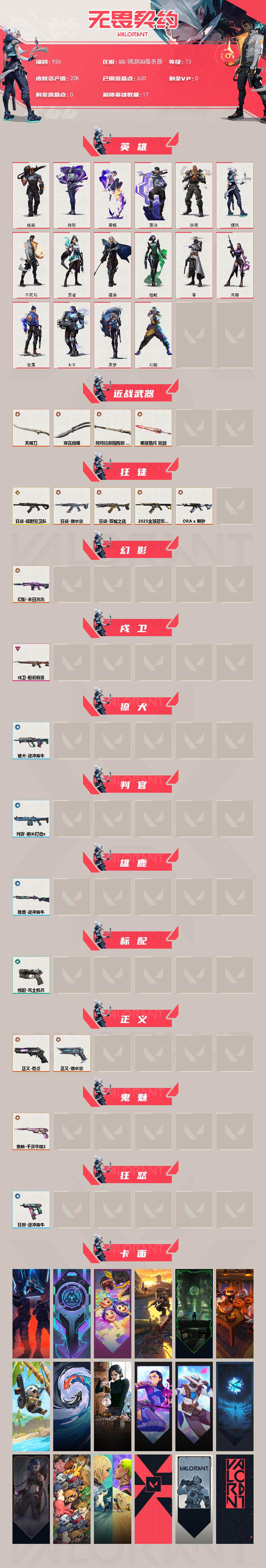 [14657549]【英雄】:幻棱,炼狱,维斯,暮蝶,壹决,铁臂,捷风,不死鸟,贤者,猎枭,蝰蛇,零,芮娜,夜露,k/o,黑梦 【近战 武器】:近战武器-穿花蝴蝶,近战武器-天御刀,近战武器-阿特拉斯指挥部 甩棍,近战武器-星际猎兵 短剑 【狂徒】:狂徒-超时空卫队,狂徒-2025全球冠军赛,狂徒-双城之战,狂徒-塑水宗,狂徒-a x 颗秒 【幻影】:幻影-末日泡泡 【戍卫】:戍卫-般若假面 【獠犬】:獠犬-逆冲蛮牛 【判官】:判官-纳米打击x 【雄鹿】:雄鹿-逆冲蛮牛 【标配】:标配-荒土机兵 【正义】:正义-奇点,正义-塑水宗 【鬼魅】:鬼魅-千灵华绽//2.0 【狂怒】:狂怒-逆冲蛮牛 【卡面】:纳米打击 卡面,抑制技术 卡面,瓦娃脸雪糕 p2 卡面,荒土机兵 卡面,欢迎来到底城 卡面,南瓜盛典 卡面,树懒大作战 卡面,红鳞松叶 卡面,虹吸式咖啡壶 卡面,无畏契约go!第一卷:芮娜 卡面,无畏契约go!第一卷:零 卡面,无垠星环 卡面,《双城之战》金克丝 卡面,同步耍酷 卡面,钢锁vs盖可 卡面,代号红色 卡面,新兵报到 卡面,v契约 卡面,无畏契约 卡面 【喷漆】:纳米打击 喷漆,独守蝰腹 喷漆,通缉:战术企鹅 喷漆,荒土机兵 喷漆,都算到了 喷漆,蛋糕还是爆能器? 喷漆,买装还是存钱 喷漆,关门放狗 喷漆,放下武器 喷漆,胜利属于无畏契约 喷漆,glhf 喷漆,无畏契约 喷漆 【挂饰】:水壶 挂饰,纳米打击 挂饰,第九季//第三幕 纪念币 挂饰,z世代特饮 挂饰,动力机箱 挂饰,天外飞客 挂饰,海豹的认可 挂饰,无畏契约 纪念币 挂饰