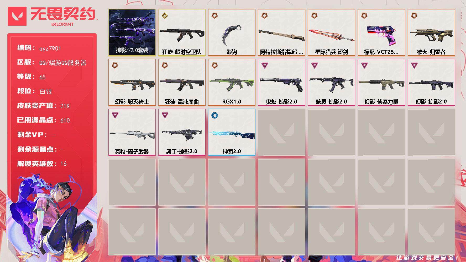 【qyz7901】掠夺20套装-超时空-混沌ak-离子大狙-侦察m4-qyz7901-套装:-掠影20套装-近战武器皮肤:-影钩-步呛皮肤:-幻影-侦察力量獠犬-归零者狂徒-混沌序曲幻影-毁灭骑士狂徒-rgx-11z-pro狂徒-超时空卫队幻影-掠影20-佩呛皮肤:-标配-vct25xprx鬼魅-掠影20-狙击呛皮肤:-冥驹-离子武器-冲锋呛皮肤:-骇灵-掠影20-机呛皮肤:-奥丁-掠影20-亮点:-【qyz7901】【套装】:掠影//20套装【英雄】:幻棱,炼狱,维斯,暮蝶,铁臂,捷风,不死鸟,贤者,猎枭,芮娜,尚勃勒,霓虹,k/o,黑梦,钢锁【近战-武器】:近战武器-影钩,近战武器-阿特拉斯指挥部-甩棍,近战武器-星际猎兵-短剑【狂徒】:狂徒-超时空卫队,狂徒-混沌序曲,狂徒-rgx-11z-pro【幻影】:幻影-毁灭骑士,幻影-侦察力量,幻影-掠影//20【獠犬】:獠犬-归零者【冥驹】:冥驹-离子武器【奥丁】:奥丁-掠影//20【雄鹿】:雄鹿-神罚//20【骇灵】:骇灵-掠影//20【vct手呛】:标配-vct25-x-prx【鬼魅】:鬼魅-掠影//20【卡面】:热舞环节-卡面,战术小伙伴的夏日-卡面,无畏契约:尚勃勒-卡面,无畏契约go!第一卷:芮娜-卡面,无畏契约go!第一卷:零-卡面,《双城之战》金克丝-卡面,无畏契约go!第一卷:贤者-卡面,钢锁vs盖可-卡面,黑影先生的咖啡!-卡面,代号红色-卡面,新兵报到-卡面,v契约-卡面,无畏契约-卡面【喷漆】:捷风差距-喷漆,致命优雅-喷漆,买装还是存钱-喷漆,关门放狗-喷漆,无畏契约go!第一卷:奇乐-喷漆,省钱大师-喷漆-,胜利属于无畏契约-喷漆,glhf-喷漆,无畏契约-喷漆【挂饰】:无畏契约go!第一卷-芮娜-挂饰,天外飞客-挂饰,无畏契约-纪念币-挂饰