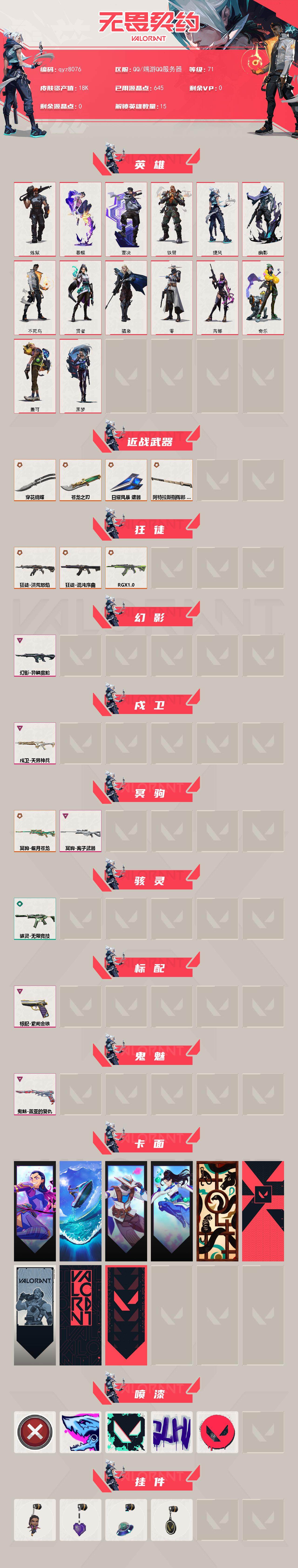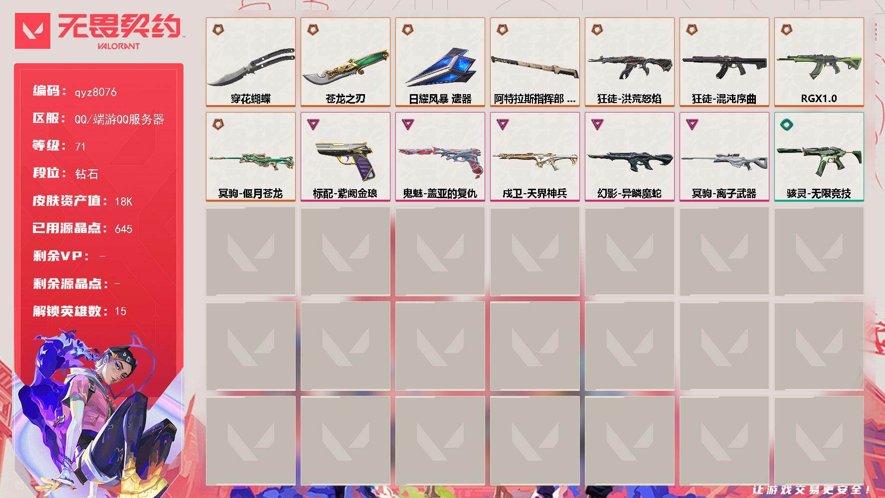 关羽小刀-穿花蝴蝶-显卡-混沌ak-蛇年m4-qyz8076-近战武器皮肤:-穿花蝴蝶苍龙之刃-步呛皮肤:-戍卫-天界神兵狂徒-洪荒怒焰狂徒-混沌序曲幻影-异鳞魔蛇狂徒-rgx-11z-pro-佩呛皮肤:-标配-紫阙金琅鬼魅-盖亚的复仇-狙击呛皮肤:-冥驹-偃月苍龙冥驹-离子武器-亮点:-【qyz8076】【英雄】:炼狱,暮蝶,壹决,铁臂,捷风,幽影,不死鸟,贤者,猎枭,零,芮娜,奇乐,盖可,黑梦【近战-武器】:近战武器-5周年//公测重制版-苍龙之刃,近战武器-穿花蝴蝶,近战武器-日耀风暴-遗器,近战武器-阿特拉斯指挥部-甩棍【狂徒】:狂徒-洪荒怒焰,狂徒-混沌序曲,狂徒-rgx-11z-pro【幻影】:幻影-异鳞魔蛇【戍卫】:戍卫-天界神兵【冥驹】:冥驹-偃月苍龙,冥驹-离子武器【骇灵】:骇灵-无限竞技【标配】:标配-紫阙金琅【鬼魅】:鬼魅-盖亚的复仇【卡面】:无畏契约go!第一卷:芮娜-卡面,复古浪潮-卡面,无畏契约go!第一卷:零-卡面,无畏契约go!第一卷:贤者-卡面,萌彩剪影-卡面,代号红色-卡面,新兵报到-卡面,v契约-卡面,无畏契约-卡面【喷漆】:买装还是存钱-喷漆,暴走萝莉-喷漆,胜利属于无畏契约-喷漆,glhf-喷漆,无畏契约-喷漆【挂饰】:无畏契约go!第一卷-芮娜-挂饰,薰衣草之心-挂饰,天外飞客-挂饰,无畏契约-纪念币-挂饰