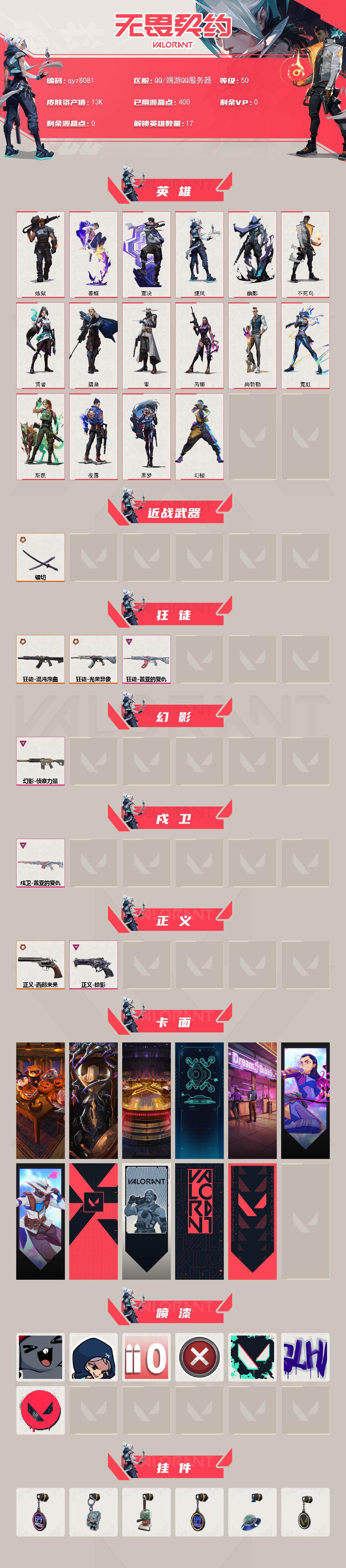 白银多热门号-qyz8081-近战武器皮肤:-镭切-步呛皮肤:-戍卫-盖亚的复仇狂徒-盖亚的复仇幻影-侦察力量狂徒-混沌序曲狂徒-光荣异象-佩呛皮肤:-正义-掠影正义-西部未来-亮点:-【qyz8081】【英雄】:幻棱,炼狱,暮蝶,壹决,捷风,幽影,不死鸟,贤者,猎枭,零,芮娜,尚勃勒,霓虹,斯凯,夜露,黑梦【近战-武器】:近战武器-镭切【狂徒】:狂徒-混沌序曲,狂徒-光荣异象,狂徒-盖亚的复仇【幻影】:幻影-侦察力量【戍卫】:戍卫-盖亚的复仇【正义】:正义-西部未来,正义-掠影【卡面】:南瓜盛典-卡面,时间到-卡面,最高舞台-卡面,声感陷阱设计图-卡面,梦幻奶茶-卡面,无畏契约go!第一卷:芮娜-卡面,无畏契约go!第一卷:零-卡面,代号红色-卡面,新兵报到-卡面,v契约-卡面,无畏契约-卡面【喷漆】:超级粉丝-喷漆,捷风差距-喷漆,拼一呛-喷漆,买装还是存钱-喷漆,胜利属于无畏契约-喷漆,glhf-喷漆,无畏契约-喷漆【挂饰】:第九季//第三幕-纪念币-挂饰,袖珍捷风-挂饰,迷你浓缩-挂饰,第九季//第一幕-纪念币-挂饰,天外飞客-挂饰,无畏契约-纪念币-挂饰