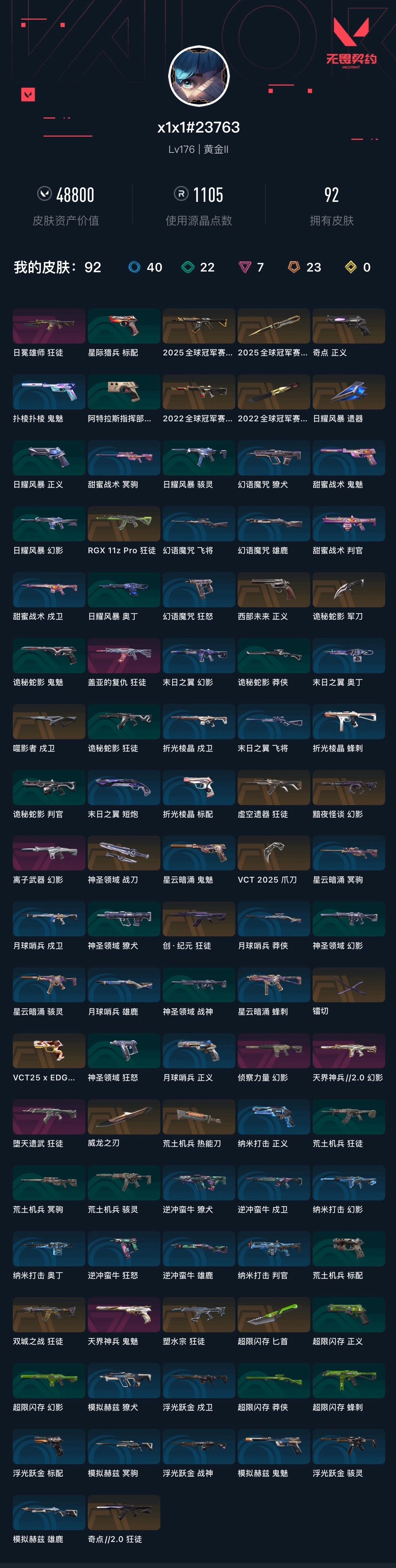 【无畏契约】【yhwww7190】等级:176,已用无畏点48800,已用源晶点1105,橙皮:幻影-黯夜怪谈|近战-超限闪存 匕首|近战-威龙之刃|狂徒-塑水宗|正义-奇点|狂徒-奇点2.0|近战-荒土机兵 热能刀|狂徒-双城之战|近战-镭切|狂徒-创·纪元|近战-神圣领域 战刀|标配-vct25 x edg|正义-西部未来|近战-vct 2025 爪刀|狂徒-虚空遗器|近战-诡秘蛇影 军刀|戍卫-噬影者|近战-日耀风暴 遗器|狂徒-rgx 11z pro|近战-2022全球冠军赛 蝴蝶刀|幻影-2022全球冠军赛|狂徒-2025全球冠军赛|近战-2025全球冠军赛 蝴蝶刀__紫皮:鬼魅-天界神兵|幻影-离子武器|幻影-天界神兵2.0|狂徒-日冕雄师|幻影-侦察力量|狂徒-盖亚的复仇|狂徒-堕天遗武__段位:黄金__蓝皮:判官-纳米打击|正义-纳米打击|奥丁-纳米打击|幻影-纳米打击|雄鹿-逆冲蛮牛|狂怒-逆冲蛮牛|戍卫-逆冲蛮牛|獠犬-逆冲蛮牛|鬼魅-星云暗涌|骇灵-星云暗涌|正义-月球哨兵|莽侠-月球哨兵|戍卫-月球哨兵|雄鹿-月球哨兵|骇灵-浮光跃金|标配-浮光跃金|戍卫-浮光跃金|战神-浮光跃金|鬼魅-模拟赫兹|獠犬-模拟赫兹|冥驹-模拟赫兹|雄鹿-模拟赫兹|鬼魅-扑棱扑棱|冥驹-星云暗涌|蜂刺-星云暗涌|蜂刺-折光棱晶|戍卫-折光棱晶|标配-折光棱晶|飞将-末日之翼|幻影-末日之翼|短炮-末日之翼|奥丁-末日之翼|鬼魅-甜蜜战术|判官-甜蜜战术|戍卫-甜蜜战术|雄鹿-幻语魔咒|獠犬-幻语魔咒|飞将-幻语魔咒|狂怒-幻语魔咒|标配-阿特拉斯指挥部__绿皮:狂徒-荒土机兵|标配-荒土机兵|骇灵-荒土机兵|冥驹-荒土机兵|獠犬-神圣领域|狂怒-神圣领域|战神-神圣领域|幻影-神圣领域|正义-超限闪存|莽侠-超限闪存|幻影-超限闪存|蜂刺-超限闪存|判官-诡秘蛇影|鬼魅-诡秘蛇影|莽侠-诡秘蛇影|狂徒-诡秘蛇影|正义-日耀风暴|幻影-日耀风暴|奥丁-日耀风暴|标配-星际猎兵__英雄:尚勃勒|维斯|黑梦|斯凯|暮蝶|盖可|霓虹|壹决|星礈|k/o|幽影|夜露|钢锁|海神|奇乐|炼狱|铁臂|贤者|猎枭|钛狐|芮娜|零|捷风|蝰蛇|不死鸟|幻棱|雷兹|禁灭