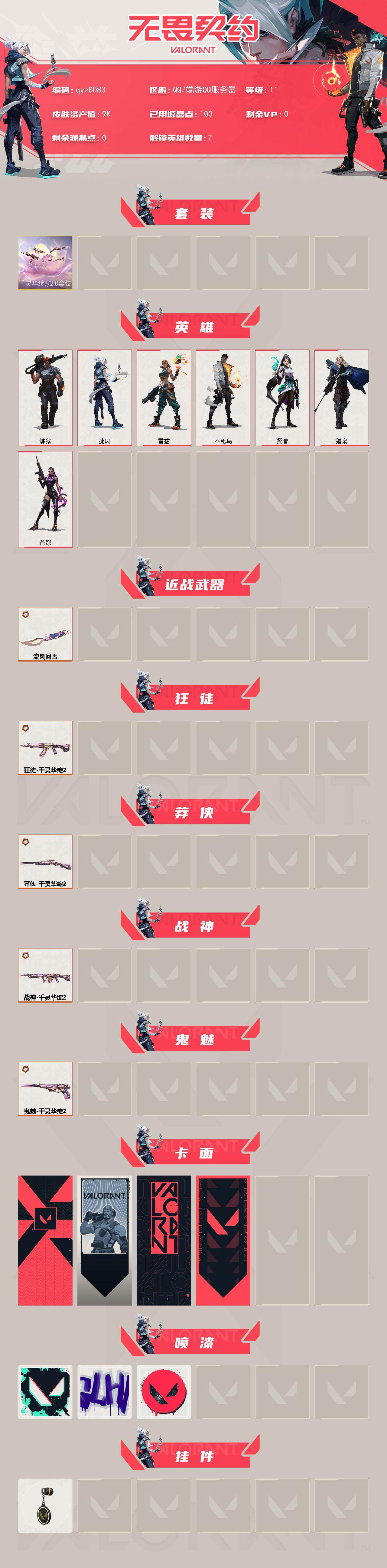 千灵华绽/20套-qyz8083-步呛皮肤:-狂徒-千灵华绽//20-佩呛皮肤:-鬼魅-千灵华绽//20-狙击呛皮肤:-莽侠-千灵华绽//20-机呛皮肤:-战神-千灵华绽//20-亮点:-【qyz8083】【套装】:千灵华绽//20套装【英雄】:炼狱,捷风,雷兹,不死鸟,贤者,猎枭,芮娜【近战-武器】:近战武器-流风回雪【狂徒】:狂徒-千灵华绽//20【莽侠】:莽侠-千灵华绽//20【战神】:战神-千灵华绽//20【鬼魅】:鬼魅-千灵华绽//20【卡面】:代号红色-卡面,新兵报到-卡面,v契约-卡面,无畏契约-卡面【喷漆】:胜利属于无畏契约-喷漆,glhf-喷漆,无畏契约-喷漆【挂饰】:无畏契约-纪念币-挂饰