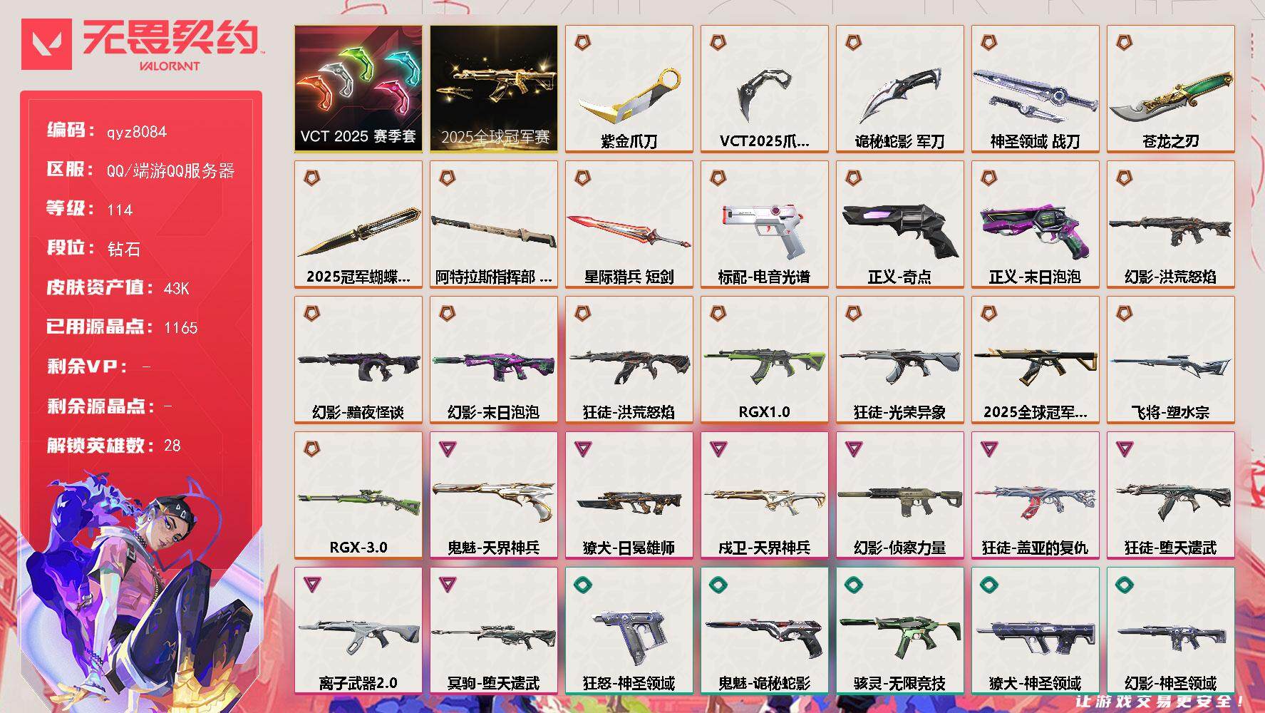 25-紫金爪-五周年小刀-25冠军套装-qyz8084-套装:-vct-2025赛季礼包2025全球冠军赛-近战武器皮肤:-紫金爪刀神圣领域-战刀vct-2025-爪刀诡秘蛇影苍龙之刃2025全球冠军赛-蝴蝶刀-步呛皮肤:-狂徒-盖亚的复仇幻影-侦察力量戍卫-天界神兵狂徒-堕天遗武幻影-洪荒怒焰狂徒-洪荒怒焰獠犬-日冕雄师幻影-黯夜怪谈狂徒-离子武器20狂徒-rgx-11z-pro狂徒-光荣异象幻影-末日泡泡2025全球冠军赛-狂徒-佩呛皮肤:-正义-奇点鬼魅-天界神兵标配-电音光谱正义-末日泡泡-狙击呛皮肤:-飞将-塑水宗冥驹-堕天遗武莽侠-rgx-11z-pro-30-亮点:-【qyz8084】【套装】:2025全球冠军赛套装,vct-2025-赛季套装【英雄】:幻棱,炼狱,维斯,暮蝶,钛狐,壹决,铁臂,捷风,雷兹,幽影,不死鸟,贤者,猎枭,蝰蛇,零,芮娜,奇乐,尚勃勒,霓虹,斯凯,夜露,星礈,k/o,海神,盖可,黑梦,钢锁【近战-武器】:近战武器-2025全球冠军赛-蝴蝶刀,近战武器-5周年//公测重制版-苍龙之刃,近战武器-vct-2025-爪刀,近战武器-紫金爪刀,近战武器-诡秘蛇影-军刀,近战武器-神圣领域-战刀,近战武器-阿特拉斯指挥部-甩棍,近战武器-星际猎兵-短剑【狂徒】:狂徒-2025全球冠军赛,狂徒-洪荒怒焰,狂徒-rgx-11z-pro,狂徒-光荣异象,狂徒-堕天遗武,狂徒-盖亚的复仇,狂徒-离子武器//20,狂徒-诡秘蛇影【幻影】:幻影-黯夜怪谈,幻影-洪荒怒焰,幻影-末日泡泡,幻影-侦察力量,幻影-神圣领域,幻影-末日之翼【戍卫】:戍卫-天界神兵,戍卫-月球哨兵,戍卫-折光棱晶【獠犬】:獠犬-日冕雄师,獠犬-神圣领域【冥驹】:冥驹-堕天遗武,冥驹-星云暗涌【飞将】:飞将-塑水宗,飞将-末日之翼【莽侠】:莽侠-rgx-11z-pro//30,莽侠-诡秘蛇影,莽侠-月球哨兵【战神】:战神-神圣领域【奥丁】:奥丁-末日之翼【判官】:判官-诡秘蛇影【雄鹿】:雄鹿-月球哨兵【骇灵】:骇灵-无限竞技,骇灵-星云暗涌【蜂刺】:蜂刺-星云暗涌,蜂刺-折光棱晶【标配】:标配-电音光谱,标配-折光棱晶,标配-电音光谱【正义】:正义-奇点,正义-末日泡泡,正义-月球哨兵【鬼魅】:鬼魅-天界神兵,鬼魅-诡秘蛇影,鬼魅-星云暗涌【狂怒】:狂怒-神圣领域
