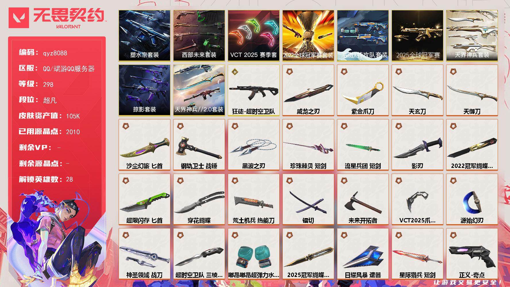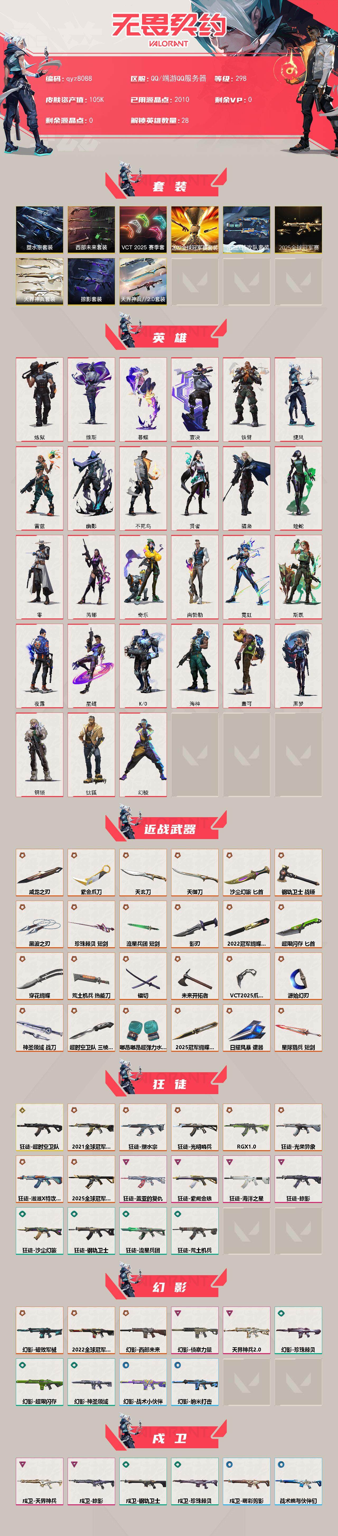 2021呛-22套-25套-西部未来套-天界神兵//20套-塑水宗套-qyz8088-亮点皮肤:-狂徒-2021全球冠军赛幻影-2022全球冠军赛蝴蝶刀-2022全球冠军赛-套装:-天界神兵套装塑水宗套装天界神兵//20套装掠影套装西部未来vct-2025赛季礼包2022全球冠军赛滋滋x特工队2025全球冠军赛-近战武器皮肤:-天玄刀匕首-沙尘幻旅紫金爪刀黑波之刃威龙之刃短剑-珍珠棘贝天御刀短剑-流星兵团战锤-钢轨卫士匕首-超限闪存影刃荒土机兵热能刀穿花蝴蝶镭切神圣领域-战刀未来开拓者vct-2025-爪刀源始幻刃超时空卫队-三棱军刺2025全球冠军赛-蝴蝶刀-步呛皮肤:-狂徒-紫阙金琅狂徒-盖亚的复仇幻影-侦察力量獠犬-归零者戍卫-天界神兵幻影-破败军械狂徒-塑水宗幻影-天界神兵20狂徒-海洋之星狂徒-光明哨兵狂徒-掠影戍卫-掠影幻影-西部未来狂徒-rgx-11z-pro狂徒-光荣异象狂徒-超时空卫队狂徒-滋滋x特攻队2025全球冠军赛-狂徒-佩呛皮肤:-标配-紫阙金琅正义-奇点鬼魅-天界神兵正义-塑水宗狂怒-天界神兵20正义-掠影正义-西部未来-狙击呛皮肤:-冥驹-偃月苍龙飞将-天界神兵飞将-塑水宗冥驹-掠影飞将-西部未来冥驹-滋滋x特攻队-冲锋呛皮肤:-蜂刺-天界神兵骇灵-塑水宗-霰弹呛皮肤:-判官-天界神兵20-机呛皮肤:-奥丁-天界神兵20奥丁-西部未来-亮点:-【qyz8088】【套装】:2025全球冠军赛套装,2022全球冠军赛套装,滋滋x特攻队套装,vct-2025-赛季套装,西部未来套装,塑水宗套装,掠影套装,天界神兵//20套装,天界神兵套装【英雄】:幻棱,炼狱,维斯,暮蝶,钛狐,壹决,铁臂,捷风,雷兹,幽影,不死鸟,贤者,猎枭,蝰蛇,零,芮娜,奇乐,尚勃勒,霓虹,斯凯,夜露,星礈,k/o,海神,盖可,黑梦,钢锁【近战-武器】:近战武器-2025全球冠军赛-蝴蝶刀,近战武器-2022全球冠军赛-蝴蝶刀,近战武器-嘟昂嘟昂超弹力水球拳套,近战武器-超时空卫队-三棱军刺,近战武器-穿花蝴蝶,近战武器-vct-2025-爪刀,近战武器-紫金爪刀,近战武器-黑波之刃,近战武器-镭切,近战武器-威龙之刃,近战武器-源始幻刃,近战武器-未来开拓者,近战武器-珍珠棘贝-短剑,近战武器-流星兵团-短剑