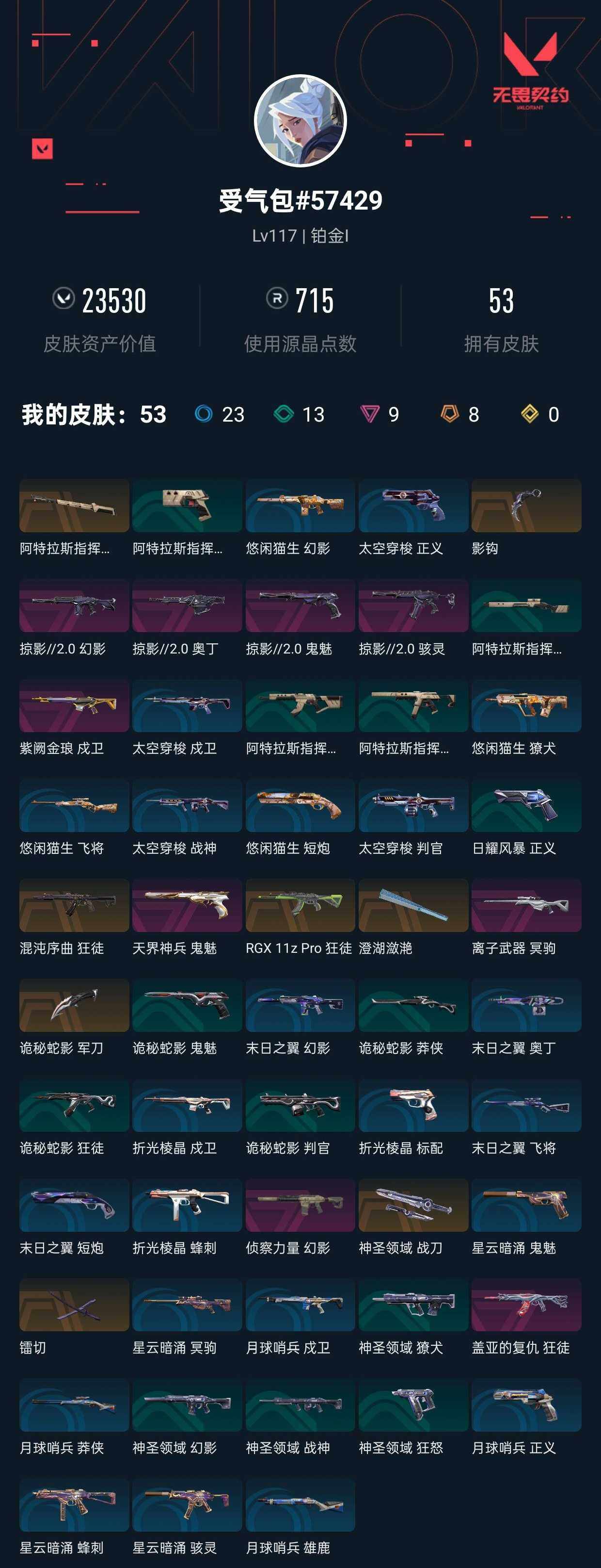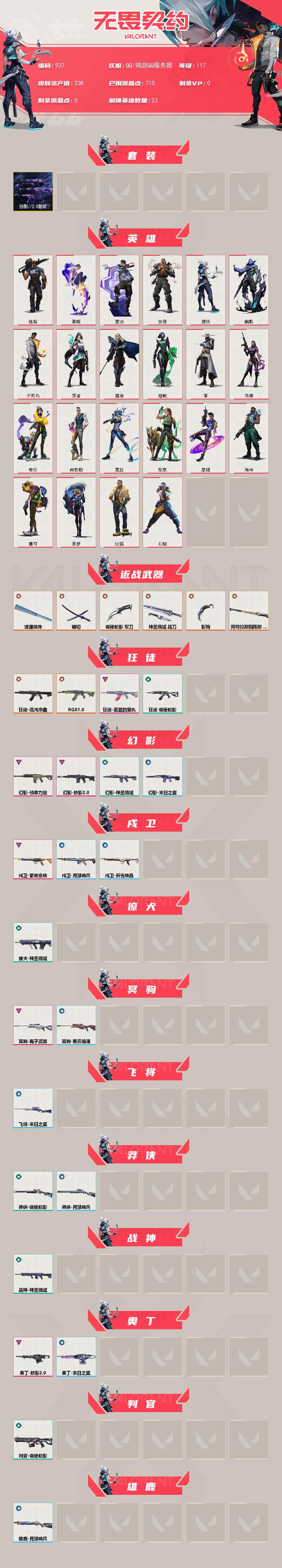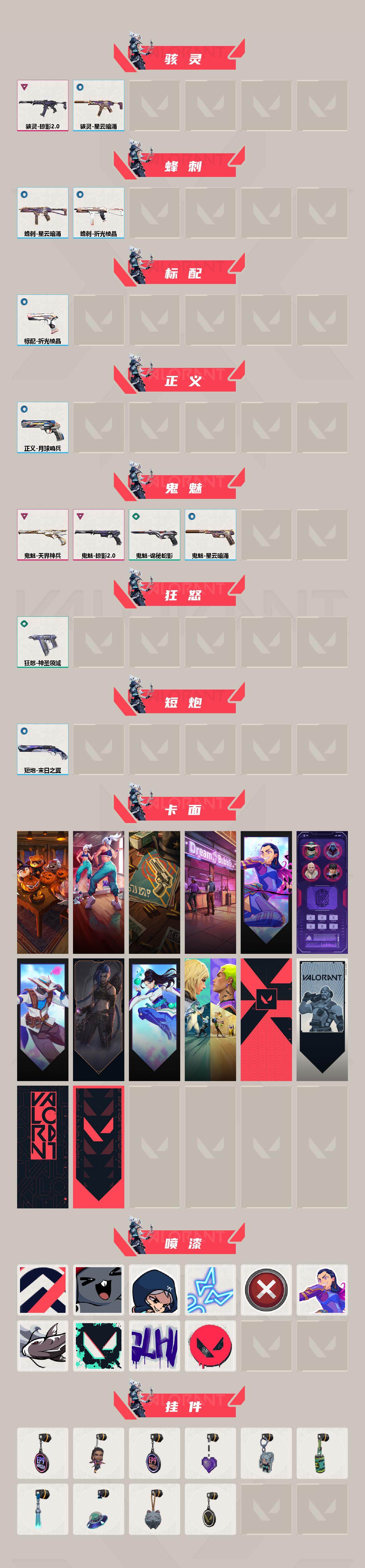 [14669648]【套装】:掠影//2.0套装 【英雄】:幻棱,炼狱,暮蝶,钛狐,壹决,铁臂,捷风,幽影,不死鸟,贤者,猎枭,蝰蛇,零,芮娜,奇乐,尚勃勒,霓虹,斯凯,星礈,海神,盖可,黑梦 【近战 武器】:近战武器-影钩,近战武器-镭切,近战武器-澄湖潋滟,近战武器-诡秘蛇影 军刀,近战武器-神圣领域 战刀,近战武器-阿特拉斯指挥部 甩棍 【狂徒】:狂徒-混沌序曲,狂徒-rgx 11z pro,狂徒-盖亚的复仇,狂徒-诡秘蛇影 【幻影】:幻影-侦察力量,幻影-掠影//2.0,幻影-神圣领域,幻影-末日之翼 【戍卫】:戍卫-紫阙金琅,戍卫-月球哨兵,戍卫-折光棱晶 【獠犬】:獠犬-神圣领域 【冥驹】:冥驹-离子武器,冥驹-星云暗涌 【飞将】:飞将-末日之翼 【莽侠】:莽侠-诡秘蛇影,莽侠-月球哨兵 【战神】:战神-神圣领域 【奥丁】:奥丁-掠影//2.0,奥丁-末日之翼 【判官】:判官-诡秘蛇影 【雄鹿】:雄鹿-月球哨兵 【骇灵】:骇灵-掠影//2.0,骇灵-星云暗涌 【蜂刺】:蜂刺-星云暗涌,蜂刺-折光棱晶 【标配】:标配-折光棱晶 【正义】:正义-月球哨兵 【鬼魅】:鬼魅-天界神兵,鬼魅-掠影//2.0,鬼魅-诡秘蛇影,鬼魅-星云暗涌 【狂怒】:狂怒-神圣领域 【短炮】:短炮-末日之翼 【卡面】:南瓜盛典 卡面,热舞环节 卡面,正义的化身 卡面,梦幻奶茶 卡面,无畏契约go!第一卷:芮娜 卡面,清除名单 卡面,无畏契约go!第一卷:零 卡面,《双城之战》金克丝 卡面,无畏契约go!第一卷:贤者 卡面,钢锁vs盖可 卡面,代号红色 卡面,新兵报到 卡面,v契约 卡面,无畏契约 卡面 【喷漆】:控场勿近 喷漆,超级粉丝 喷漆,捷风差距 喷漆,霓光四射 喷漆,买装还是存钱 喷漆,无畏契约go!第一卷:芮娜 喷漆,松叶 喷漆,胜利属于无畏契约 喷漆,glhf 喷漆,无畏契约 喷漆 【挂饰】:第九季//第三幕 纪念币 挂饰,无畏契约go!第一卷 芮娜 挂饰,第九季//第二幕 纪念币 挂饰,薰衣草之心 挂饰,袖珍捷风 挂饰,z世代特饮 挂饰,荧光棒 挂饰,天外飞客 挂饰,《双城之战》魄罗 挂饰,无畏契约 纪念币 挂饰