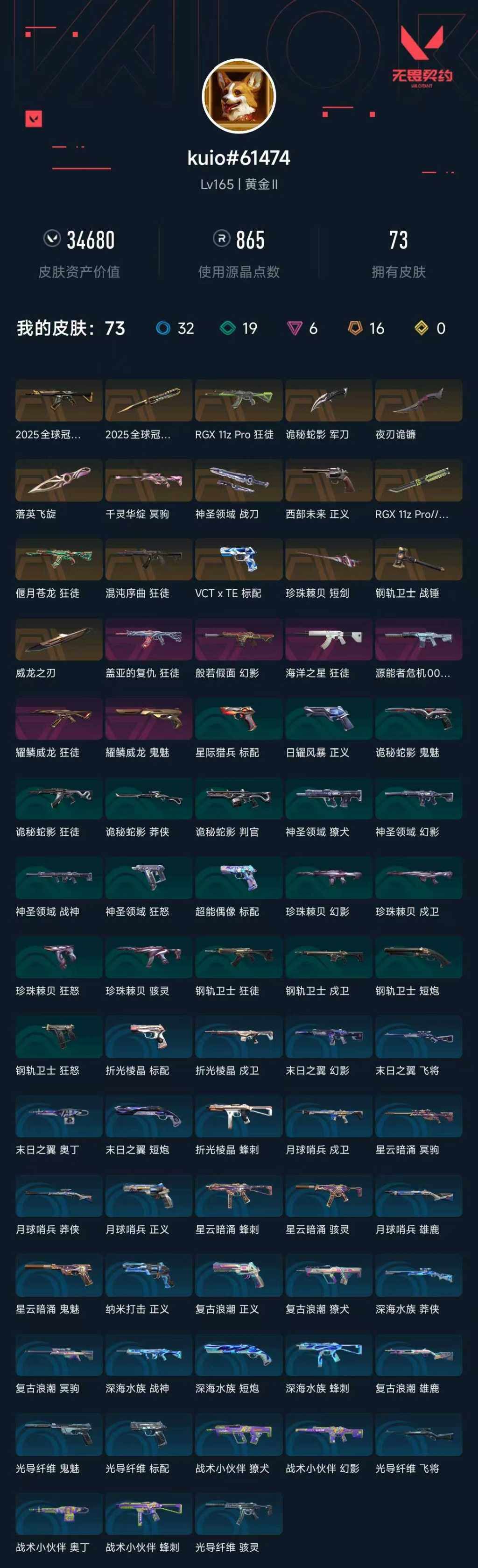 [14669546]【套装】:2025全球冠军赛套装,耀鳞威龙套装 【英雄】:幻棱,炼狱,维斯,暮蝶,钛狐,壹决,铁臂,捷风,雷兹,幽影,不死鸟,贤者,猎枭,蝰蛇,零,芮娜,奇乐,尚勃勒,霓虹,斯凯,夜露,星礈,k/o,海神,盖可,黑梦,钢锁 【近战 武器】:近战武器-2025全球冠军赛 蝴蝶刀,近战武器-rgx 11z pro//2.0 蝴蝶刀,近战武器-落英飞旋,近战武器-威龙之刃,近战武器-珍珠棘贝 短剑,近战武器-钢轨卫士 战锤,近战武器-夜刃诡镰,近战武器-诡秘蛇影 军刀,近战武器-神圣领域 战刀 【狂徒】:狂徒-2025全球冠军赛,狂徒-混沌序曲,狂徒-偃月苍龙,狂徒-rgx 11z pro,狂徒-盖亚的复仇,狂徒-海洋之星,狂徒-耀鳞威龙,狂徒-钢轨卫士,狂徒-诡秘蛇影 【幻影】:幻影-般若假面,幻影-源能者危机001,幻影-珍珠棘贝,幻影-神圣领域,幻影-战术小伙伴,幻影-末日之翼 【戍卫】:戍卫-钢轨卫士,戍卫-珍珠棘贝,戍卫-月球哨兵,戍卫-折光棱晶 【獠犬】:獠犬-神圣领域,獠犬-复古浪潮,獠犬-战术小伙伴 【冥驹】:冥驹-千灵华绽,冥驹-复古浪潮,冥驹-星云暗涌 【飞将】:飞将-光导纤维,飞将-末日之翼 【莽侠】:莽侠-诡秘蛇影,莽侠-深海水族,莽侠-月球哨兵 【战神】:战神-神圣领域,战神-深海水族 【奥丁】:奥丁-战术小伙伴,奥丁-末日之翼 【判官】:判官-诡秘蛇影 【雄鹿】:雄鹿-复古浪潮,雄鹿-月球哨兵 【骇灵】:骇灵-珍珠棘贝,骇灵-光导纤维,骇灵-星云暗涌 【蜂刺】:蜂刺-深海水族,蜂刺-战术小伙伴,蜂刺-星云暗涌,蜂刺-折光棱晶 【标配】:标配-超能偶像,标配-光导纤维,标配-折光棱晶 【vct手呛】:标配-vct x te 【正义】:正义-西部未来,正义-复古浪潮,正义-纳米打击,正义-月球哨兵 【鬼魅】:鬼魅-耀鳞威龙,鬼魅-诡秘蛇影,鬼魅-光导纤维,鬼魅-星云暗涌 【狂怒】:狂怒-钢轨卫士,狂怒-珍珠棘贝,狂怒-神圣领域 【短炮】:短炮-钢轨卫士,短炮-深海水族,短炮-末日之翼 【卡面】:进入射程 卡面,瓦娃脸雪糕 p2 卡面,《双城之战》拥抱 卡面,精灵大战 卡面,欢迎来到底城 卡面,南瓜盛典 卡面,修车达人 卡面,维斯工牌 卡面,正义的化身 卡面,铁之华 卡面,时间到 卡面,最高舞台 卡面,树懒大作战 卡面,声感陷阱设计图 卡面,红鳞松