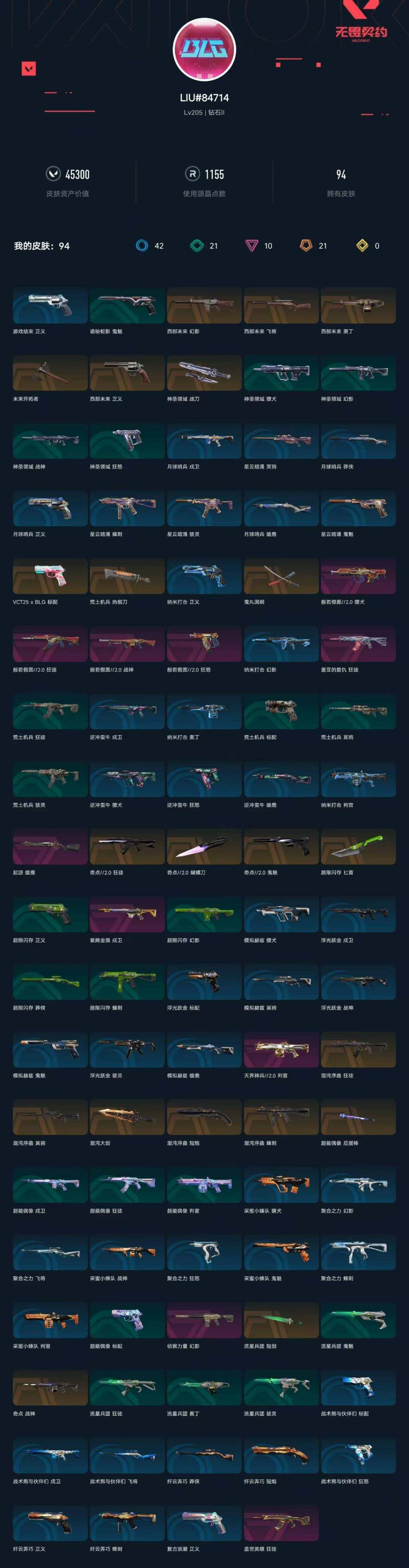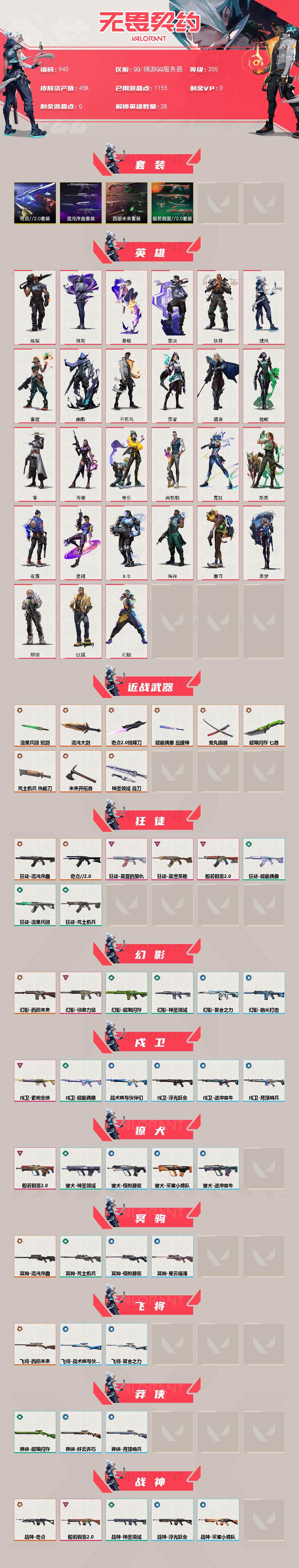 [14670039]【套装】:西部未来套装,混沌序曲套装,奇点//2.0套装,般若假面//2.0套装 【英雄】:幻棱,炼狱,维斯,暮蝶,钛狐,壹决,铁臂,捷风,雷兹,幽影,不死鸟,贤者,猎枭,蝰蛇,零,芮娜,奇乐,尚勃勒,霓虹,斯凯,夜露,星礈,k/o,海神,盖可,黑梦,钢锁 【近战 武器】:近战武器-奇点//2.0 蝴蝶刀,近战武器-鬼丸国纲,近战武器-未来开拓者,近战武器-混沌大剑,近战武器-流星兵团 短剑,近战武器-超能偶像 应援棒,近战武器-超限闪存 匕首,近战武器-荒土机兵 热能刀,近战武器-神圣领域 战刀 【狂徒】:狂徒-混沌序曲,狂徒-奇点//2.0,狂徒-般若假面//2.0,狂徒-盖世英雄,狂徒-盖亚的复仇,狂徒-超能偶像,狂徒-荒土机兵,狂徒-流星兵团 【幻影】:幻影-西部未来,幻影-侦察力量,幻影-超限闪存,幻影-神圣领域,幻影-聚合之力,幻影-纳米打击,幻影-西部未来 【戍卫】:戍卫-紫阙金琅,戍卫-超能偶像,戍卫-浮光跃金,戍卫-逆冲蛮牛,戍卫-战术熊与伙伴们,戍卫-月球哨兵 【獠犬】:獠犬-般若假面//2.0,獠犬-神圣领域,獠犬-采蜜小蜂队,獠犬-模拟赫兹,獠犬-逆冲蛮牛 【冥驹】:冥驹-混沌序曲,冥驹-荒土机兵,冥驹-模拟赫兹,冥驹-星云暗涌 【飞将】:飞将-西部未来,飞将-聚合之力,飞将-战术熊与伙伴们 【莽侠】:莽侠-超限闪存,莽侠-纤云弄巧,莽侠-月球哨兵 【战神】:战神-奇点,战神-般若假面//2.0,战神-神圣领域,战神-采蜜小蜂队,战神-浮光跃金 【奥丁】:奥丁-西部未来,奥丁-流星兵团,奥丁-纳米打击 【判官】:判官-天界神兵//2.0,判官-超能偶像,判官-采蜜小蜂队,判官-纳米打击x 【雄鹿】:雄鹿-起源,雄鹿-模拟赫兹,雄鹿-逆冲蛮牛,雄鹿-月球哨兵 【骇灵】:骇灵-荒土机兵,骇灵-流星兵团,骇灵-浮光跃金,骇灵-星云暗涌 【蜂刺】:蜂刺-混沌序曲,蜂刺-超限闪存,蜂刺-聚合之力,蜂刺-纤云弄巧,蜂刺-星云暗涌 【标配】:标配-超能偶像,标配-荒土机兵,标配-浮光跃金,标配-战术熊与伙伴们 【vct手呛】:标配-vct25 x blg 【正义】:正义-西部未来,正义-超限闪存,正义-复古浪潮,正义-纳米打击,正义-纤云弄巧,正义-游戏结束,正义-月球哨兵 【鬼魅】:鬼魅-奇点//2.0,鬼魅-流星兵团,鬼魅-诡秘蛇影,鬼魅-采蜜小蜂队