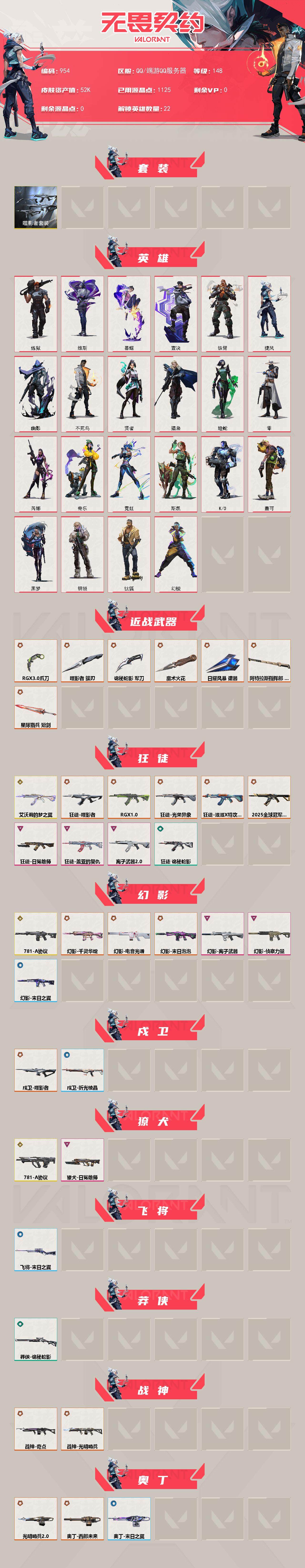 [14674283]【套装】:噬影者套装 【英雄】:幻棱,炼狱,维斯,暮蝶,钛狐,壹决,铁臂,捷风,幽影,不死鸟,贤者,猎枭,蝰蛇,零,芮娜,奇乐,霓虹,斯凯,k/o,盖可,黑梦,钢锁 【近战 武器】:近战武器-魔术火花,近战武器-rgx 11z pro//3.0 爪刀,近战武器-噬影者 簇刃,近战武器-诡秘蛇影 军刀,近战武器-日耀风暴 遗器,近战武器-阿特拉斯指挥部 甩棍,近战武器-星际猎兵 短剑,近战武器-魔术火花 【狂徒】:狂徒-艾沃莉的梦之翼,狂徒-2025全球冠军赛,狂徒-噬影者,狂徒-rgx 11z pro,狂徒-光荣异象,狂徒-滋滋x特攻队,狂徒-盖亚的复仇,狂徒-日冕雄师,狂徒-离子武器//2.0,狂徒-诡秘蛇影 【幻影】:幻影-781-a协议,幻影-千灵华绽,幻影-电音光谱,幻影-末日泡泡,幻影-离子武器,幻影-侦察力量,幻影-末日之翼,幻影-电音光谱 【戍卫】:戍卫-噬影者,戍卫-折光棱晶 【獠犬】:獠犬-781-a协议,獠犬-日冕雄师 【飞将】:飞将-末日之翼 【莽侠】:莽侠-诡秘蛇影 【战神】:战神-光明哨兵,战神-奇点 【奥丁】:奥丁-光明哨兵//2.0,奥丁-西部未来,奥丁-末日之翼 【判官】:判官-诡秘蛇影 【骇灵】:骇灵-创·纪元,骇灵-无限竞技 【蜂刺】:蜂刺-噬影者,蜂刺-折光棱晶 【标配】:标配-折光棱晶 【vct手呛】:标配-vct25 x blg 【正义】:正义-千灵华绽 【鬼魅】:鬼魅-噬影者,鬼魅-诡秘蛇影 【短炮】:短炮-末日之翼 【卡面】:无畏契约:暮蝶 卡面,红鳞松叶 卡面,无畏契约go!第一卷:芮娜 卡面,无畏契约go!第一卷:零 卡面,《双城之战》金克丝 卡面,无畏契约go!第一卷:贤者 卡面,代号红色 卡面,新兵报到 卡面,v契约 卡面,无畏契约 卡面 【喷漆】:伤心心 喷漆,买装还是存钱 喷漆,暴走萝莉 喷漆,胜利属于无畏契约 喷漆,glhf 喷漆,无畏契约 喷漆 【挂饰】:糖葫芦 挂饰,超能偶像 挂饰,天外飞客 挂饰,红鳞松叶 挂饰,《双城之战》魄罗 挂饰,无畏契约 纪念币 挂饰