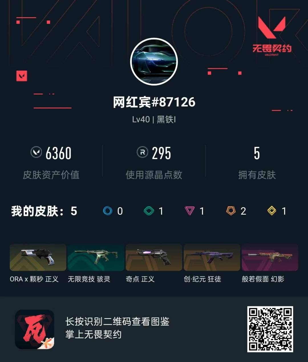 2橙皮 1金皮 1紫皮 5皮肤 18英雄 32卡面 295已用源晶 黑铁段位 【佩呛皮肤】正义-ax颗秒正义-奇点 【步呛皮肤】幻影-般若假面狂徒-创·纪元 【挂饰】神中神挂饰深度分割挂饰