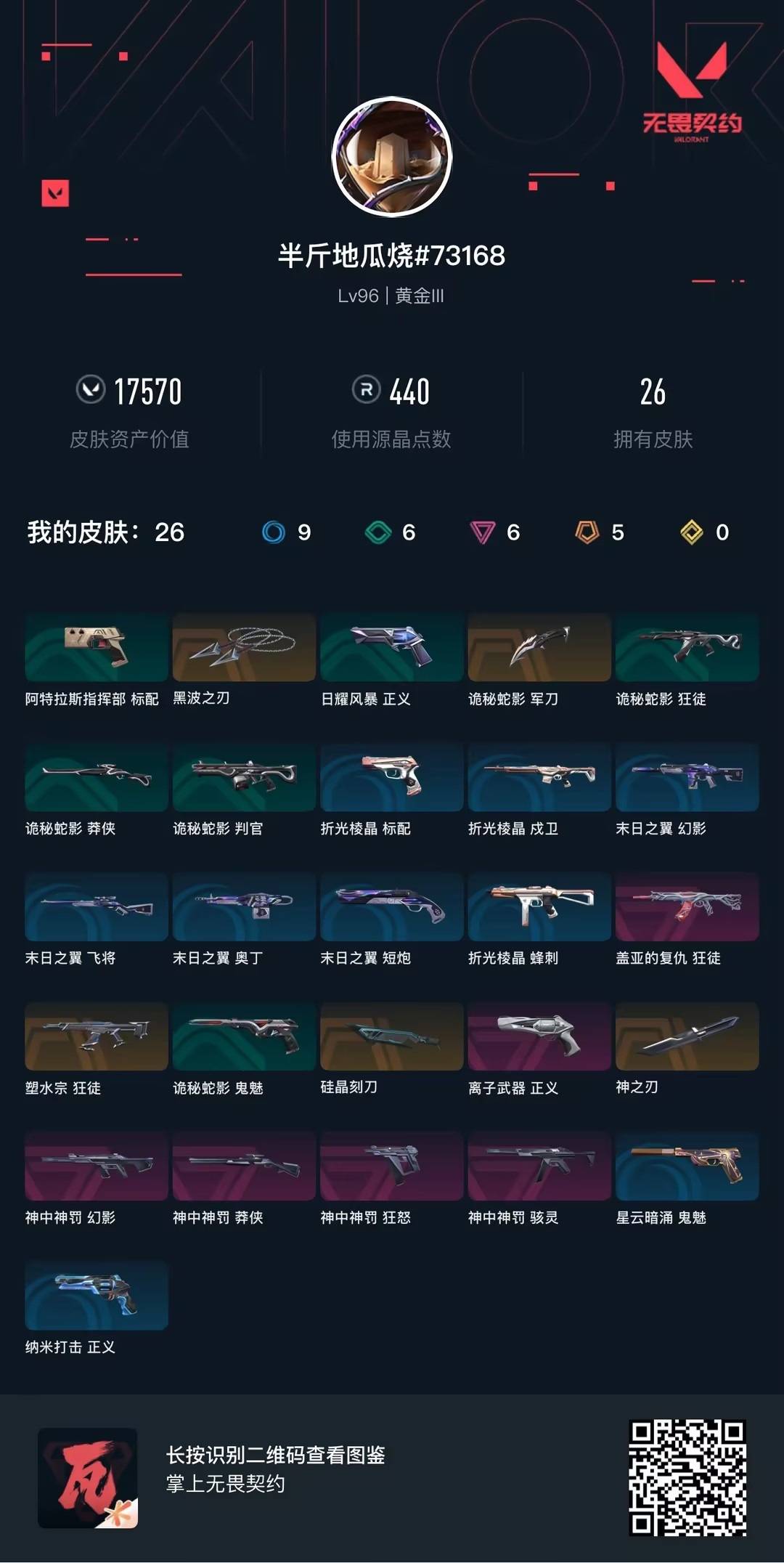 [14682522]5橙皮 6紫皮 26皮肤 15英雄 59卡面 440已用源晶 黄金段位 【套装】神罚套装神中神罚套装 【近战武器皮肤】诡秘蛇影黑波之刃神之刃硅晶刻刀 【佩呛皮肤】正义-离子武器狂怒-神中神罚 【冲锋呛皮肤】骇灵-神中神罚 【步呛皮肤】狂徒-塑水宗狂徒-盖亚的复仇幻影-神中神罚 【狙击呛皮肤】莽侠-神中神罚 【挂饰】神中神罚挂饰神中神挂饰袖珍捷风挂饰