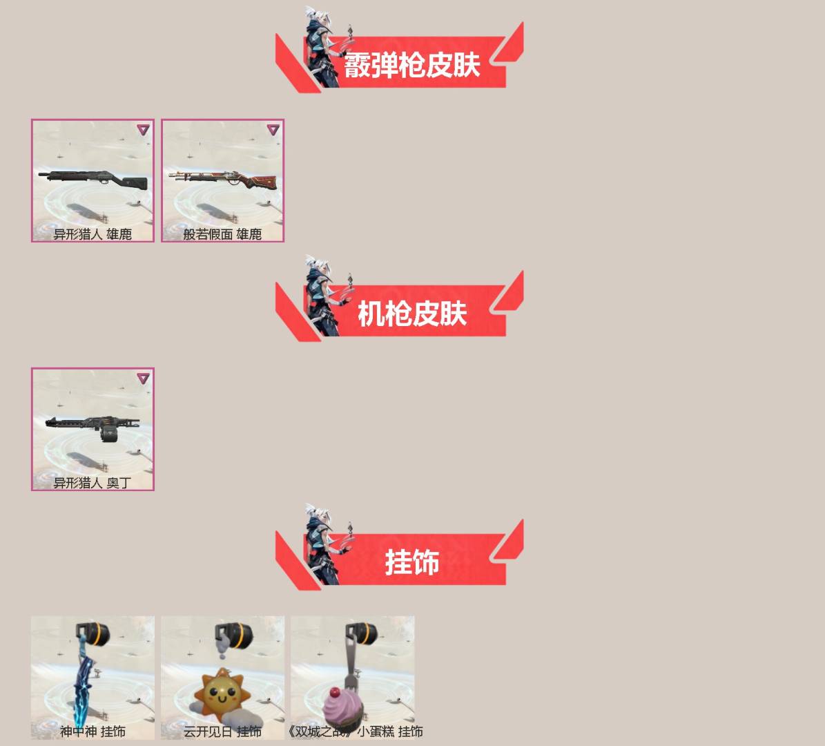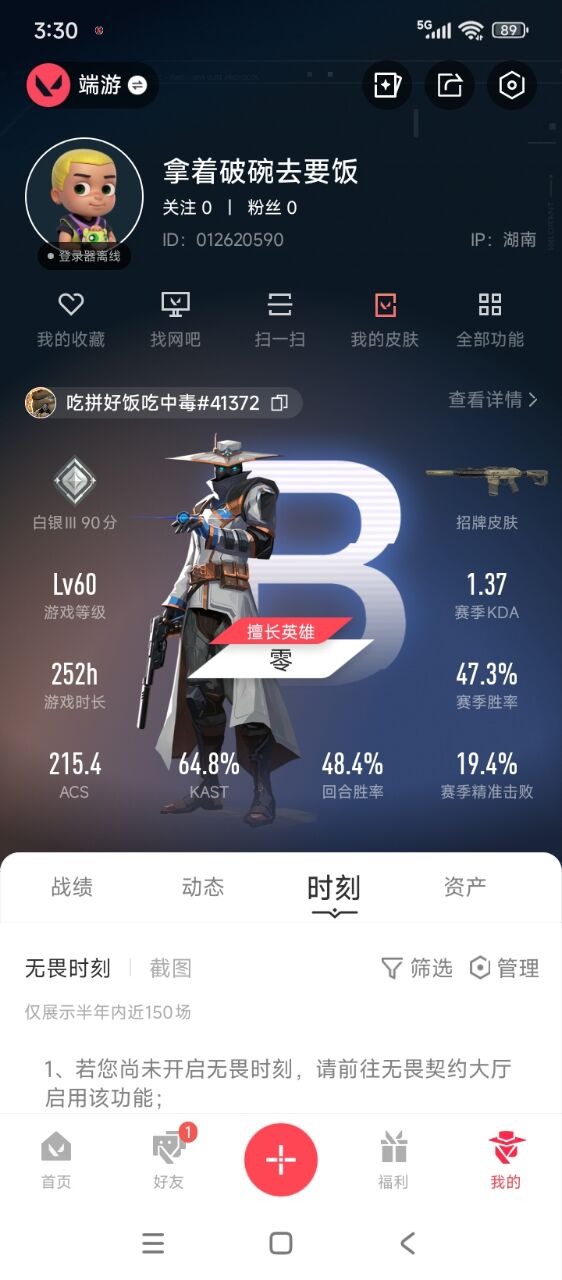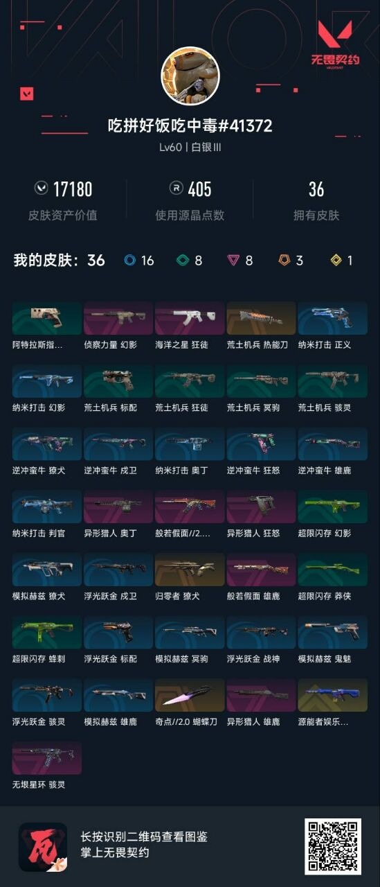 3橙皮 1金皮 8紫皮 36皮肤 17英雄 47卡面 405已用源晶 未定级段位 【近战武器皮肤】:蝴蝶刀-奇点//2.0荒土机兵热能刀 【佩呛皮肤】:狂怒-异形猎人 【冲锋呛皮肤】:骇灵-无垠星环 【霰弹呛皮肤】:雄鹿-般若假面雄鹿-异形猎人 【步呛皮肤】:狂徒-般若假面//2.0狂徒-海