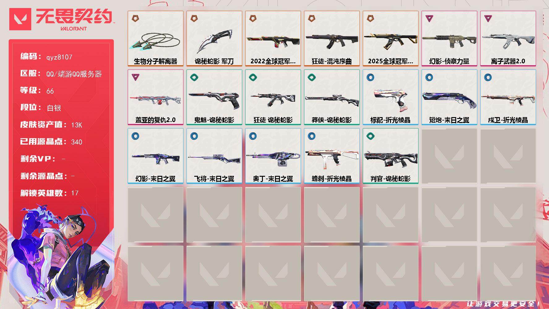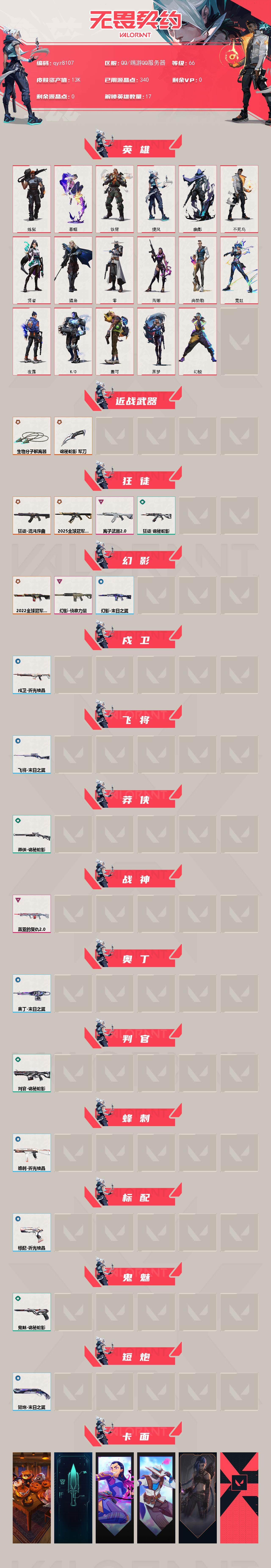 25冠军狂徒-22冠军-混沌狂徒离子狂徒侦查力量-生物分子解离器-qyz8107-亮点皮肤:-幻影-2022全球冠军赛-近战武器皮肤:-生物分子解离器诡秘蛇影-步呛皮肤:-幻影-侦察力量狂徒-混沌序曲狂徒-离子武器202025全球冠军赛-狂徒-机呛皮肤:-战神-盖亚的复仇20-亮点:-【qyz8107】【英雄】:幻棱,炼狱,暮蝶,铁臂,捷风,幽影,不死鸟,贤者,猎枭,零,芮娜,尚勃勒,霓虹,夜露,k/o,盖可,黑梦【近战-武器】:近战武器-生物分子解离器,近战武器-诡秘蛇影-军刀【狂徒】:狂徒-2025全球冠军赛,狂徒-混沌序曲,狂徒-离子武器//20,狂徒-诡秘蛇影【幻影】:幻影-2022全球冠军赛,幻影-侦察力量,幻影-末日之翼【戍卫】:戍卫-折光棱晶【飞将】:飞将-末日之翼【莽侠】:莽侠-诡秘蛇影【战神】:战神-盖亚的复仇//20【奥丁】:奥丁-末日之翼【判官】:判官-诡秘蛇影【蜂刺】:蜂刺-折光棱晶【标配】:标配-折光棱晶【鬼魅】:鬼魅-诡秘蛇影【短炮】:短炮-末日之翼【卡面】:南瓜盛典-卡面,零点嗅探设计图-卡面,无畏契约go!第一卷:芮娜-卡面,无畏契约go!第一卷:零-卡面,《双城之战》金克丝-卡面,代号红色-卡面,新兵报到-卡面,v契约-卡面,无畏契约-卡面【喷漆】:买装还是存钱-喷漆,关门放狗-喷漆,胜利属于无畏契约-喷漆,glhf-喷漆,无畏契约-喷漆【挂饰】:天外飞客-挂饰,《双城之战》魄罗-挂饰,无畏契约-纪念币-挂饰