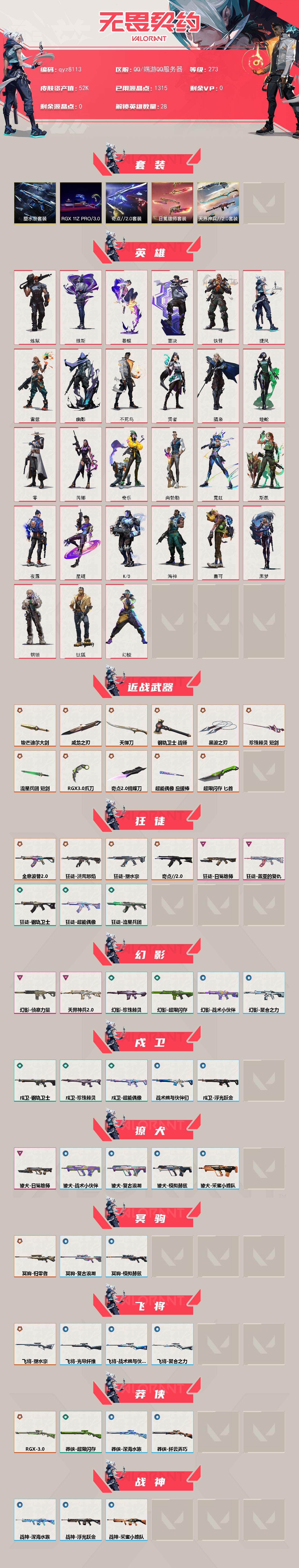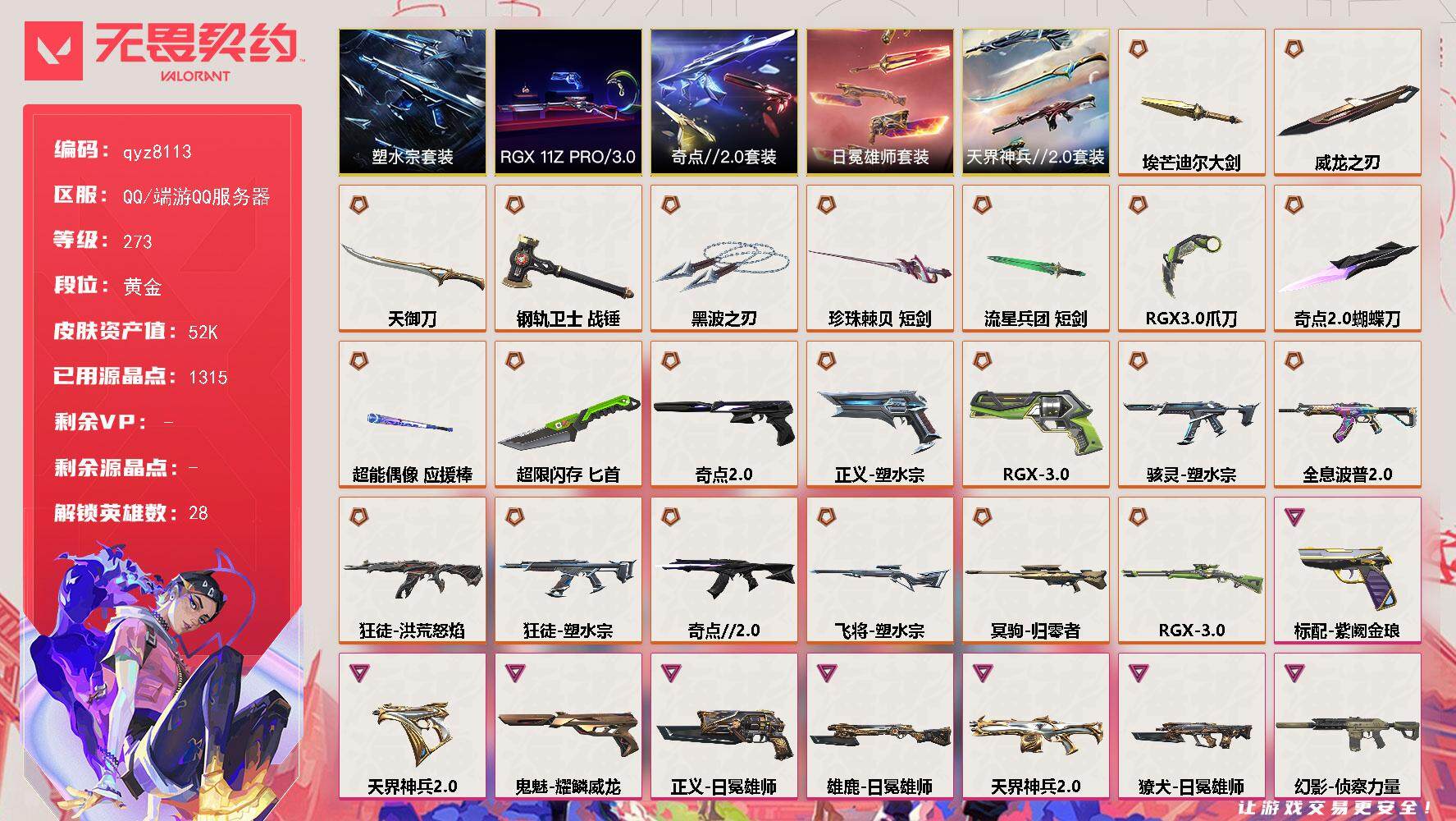 精品塑水宗套白银号-低价捡漏出喜欢的来吧-qyz8113-套装:-塑水宗套装天界神兵//20套装rgx-11z-pro//30套装日冕雄师套装奇点//20套装-近战武器皮肤:-黑波之刃威龙之刃短剑-珍珠棘贝天御刀埃芒迪尔大剑超能偶像-应援棒爪刀-rgx-11z-pro-30短剑-流星兵团战锤-钢轨卫士匕首-超限闪存蝴蝶刀-奇点//20-步呛皮肤:-狂徒-盖亚的复仇幻影-侦察力量狂徒-塑水宗狂徒-洪荒怒焰幻影-天界神兵20獠犬-日冕雄师狂徒-日冕雄师狂徒-全息波普//20狂徒-奇点//20-佩呛皮肤:-标配-紫阙金琅正义-塑水宗鬼魅-耀鳞威龙狂怒-天界神兵20正义-日冕雄师正义-rgx-11z-pro-30鬼魅-奇点//20-狙击呛皮肤:-冥驹-归零者飞将-塑水宗莽侠-rgx-11z-pro-30-冲锋呛皮肤:-骇灵-塑水宗-霰弹呛皮肤:-判官-天界神兵20雄鹿-日冕雄师-机呛皮肤:-奥丁-天界神兵20-亮点:-【qyz8113】【套装】:rgx-11z-pro//30套装,塑水宗套装,奇点//20套装,天界神兵//20套装,日冕雄师套装【英雄】:幻棱,炼狱,维斯,暮蝶,钛狐,壹决,铁臂,捷风,雷兹,幽影,不死鸟,贤者,猎枭,蝰蛇,零,芮娜,奇乐,尚勃勒,霓虹,斯凯,夜露,星礈,k/o,海神,盖可,黑梦,钢锁【近战-武器】:近战武器-奇点//20-蝴蝶刀,近战武器-rgx-11z-pro//30-爪刀,近战武器-黑波之刃,近战武器-威龙之刃,近战武器-埃芒迪尔大剑,近战武器-珍珠棘贝-短剑,近战武器-流星兵团-短剑,近战武器-超能偶像-应援棒,近战武器-超限闪存-匕首,近战武器-钢轨卫士-战锤,近战武器-天御刀【狂徒】:狂徒-洪荒怒焰,狂徒-奇点//20,狂徒-全息波普//20,狂徒-塑水宗,狂徒-盖亚的复仇,狂徒-日冕雄师,狂徒-超能偶像,狂徒-钢轨卫士,狂徒-流星兵团【幻影】:幻影-天界神兵//20,幻影-侦察力量,幻影-超限闪存,幻影-珍珠棘贝,幻影-聚合之力,幻影-战术小伙伴【戍卫】:戍卫-超能偶像,戍卫-钢轨卫士,戍卫-珍珠棘贝,戍卫-浮光跃金,戍卫-战术熊与伙伴们【獠犬】:獠犬-日冕雄师,獠犬-采蜜小蜂队,獠犬-复古浪潮,獠犬-模拟赫兹,獠犬-战术小伙伴【冥驹】:冥驹-归零者,冥驹-复古浪潮