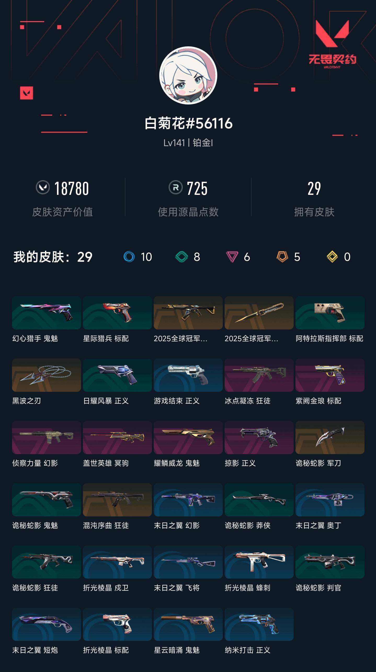 【ww1164】终极5/卓越6/皮肤29/等级141/段位:铂金/2025全球冠军赛套装/幻棱/炼狱/维斯/暮蝶/钛狐/壹决/铁臂/捷风/雷兹/幽影/不死鸟/贤者/猎枭/蝰蛇/零/芮娜/尚勃勒/霓虹/夜露/星礈/k/o/盖可/黑梦/钢锁/近战武器-2025全球冠军赛 蝴蝶刀/近战武器-黑波之刃/近战武器-诡秘蛇影 军刀/狂徒-2025全球冠军赛/狂徒-混沌序曲/狂徒-冰点凝冻/狂徒-诡秘蛇影/幻影-侦察力量/幻影-末日之翼/戍卫-折光棱晶/冥驹-盖世英雄/飞将-末日之翼/莽侠-诡秘蛇影/奥丁-末日之翼/判官-诡秘蛇影/蜂刺-折光棱晶/标配-紫阙金琅/标配-折光棱晶/正义-掠影/正义-纳米打击/正义-游戏结束/鬼魅-耀鳞威龙/鬼魅-诡秘蛇影/鬼魅-星云暗涌/短炮-末日之翼/终章:激斗汉堡 卡面/进入射程 卡面/《双城之战》拥抱 卡面/精灵大战 卡面/欢迎来到底城 卡面/南瓜盛典 卡面/正义的化身 卡面/红鳞松叶 卡面/梦幻奶茶 卡面/无畏契约go!第一卷:芮娜 卡面/无畏契约go!第一卷:零 卡面/《双城之战》金克丝 卡面/无畏契约go!第一卷:贤者 卡面/代号红色 卡面/新兵报到 卡面/v契约 卡面/无畏契约 卡面/嗨宝南瓜灯 喷漆/嘭! 喷漆/都算到了 喷漆/控场勿近 喷漆/捷风差距 喷漆/买装还是存钱 喷漆/关门放狗 喷漆/胜利属于无畏契约 喷漆/glhf 喷漆/无畏契约 喷漆/终章:猫猫木乃伊 挂饰/悠闲鸡块 挂饰/伞绳 挂饰/《双城之战》小蛋糕 挂饰/第九季//第三幕 纪念币 挂饰/袖珍捷风 挂饰/z世代特饮 挂饰/天外飞客 挂饰/红鳞松叶 挂饰/无畏契约 纪念币 挂饰