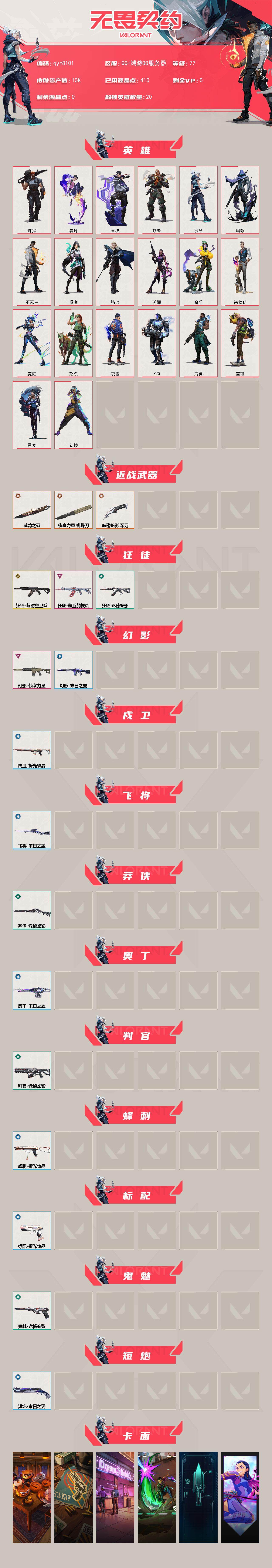【qyz8101】【英雄】:幻棱,炼狱,暮蝶,壹决,铁臂,捷风,幽影,不死鸟,贤者,猎枭,芮娜,奇乐,尚勃勒,霓虹,斯凯,夜露,k/o,海神,盖可,黑梦-【近战-武器】:近战武器-侦察力量-蝴蝶刀,近战武器-威龙之刃,近战武器-诡秘蛇影-军刀-【狂徒】:狂徒-超时空卫队,狂徒-盖亚的复仇,狂徒-诡秘蛇影-【幻影】:幻影-侦察力量,幻影-末日之翼-【戍卫】:戍卫-折光棱晶-【飞将】:飞将-末日之翼-【莽侠】:莽侠-诡秘蛇影-【奥丁】:奥丁-末日之翼-【判官】:判官-诡秘蛇影-【蜂刺】:蜂刺-折光棱晶-【标配】:标配-折光棱晶-【鬼魅】:鬼魅-诡秘蛇影-【短炮】:短炮-末日之翼-【卡面】:南瓜盛典-卡面,正义的化身-卡面,梦幻奶茶-卡面,源能反应-卡面,零点嗅探设计图-卡面,无畏契约go!第一卷:芮娜-卡面,无畏契约go!第一卷:零-卡面,《双城之战》金克丝-卡面,别冒尖-卡面,代号红色-卡面,新兵报到-卡面,v契约-卡面,无畏契约-卡面-【喷漆】:捷风差距-喷漆,我觉得不行-喷漆,我的刀呢?-喷漆,买装还是存钱-喷漆,关门放狗-喷漆,胜利属于无畏契约-喷漆,glhf-喷漆,无畏契约-喷漆-【挂饰】:第九季//第二幕-纪念币-挂饰,荧光棒-挂饰,第八季//第三幕-纪念币-挂饰,天外飞客-挂饰,好运福爪-挂饰,无畏契约-纪念币-挂饰