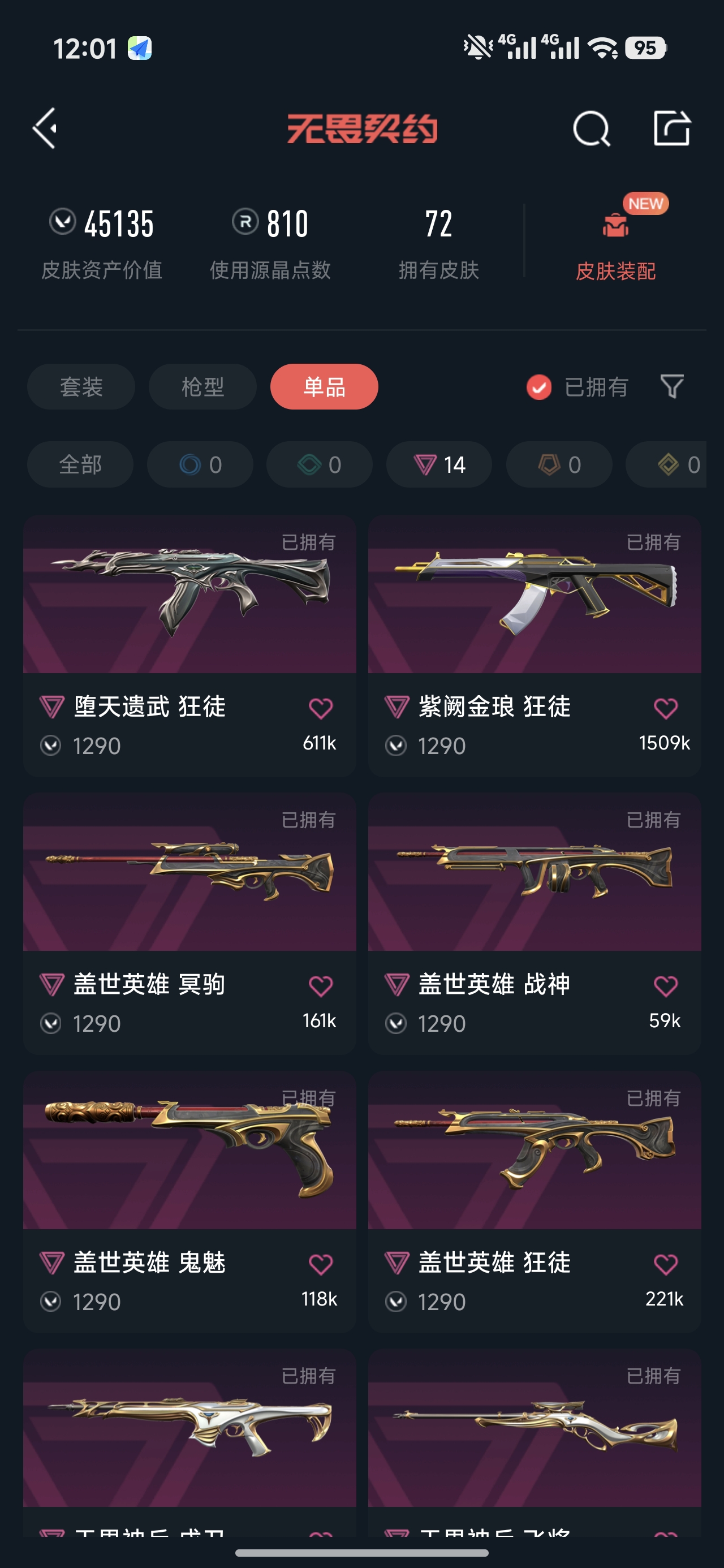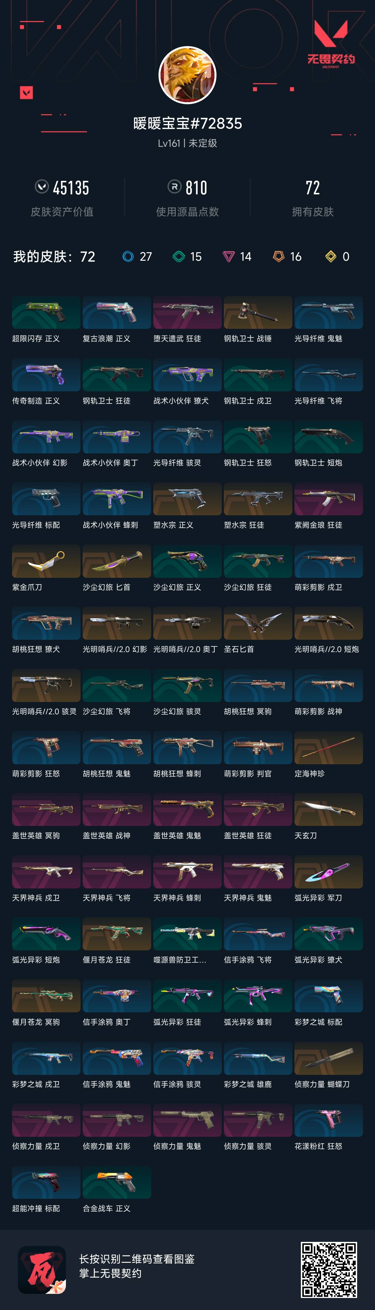 [14690221]l191611 (光明哨兵2.0套装/天界神兵套装/盖世英雄套装/侦察力量套装)无畏契约/161级/未定级/25英雄/72皮肤/资产45135/已使用r点810/剩余r点0/光明哨兵//2.0-幻影,光明哨兵//2.0-奥丁,光明哨兵//2.0-骇灵,光明哨兵//2.0-短炮,圣石匕首,天界神兵-戍卫,天界神兵-飞将,天界神兵-蜂刺,天界神兵-鬼魅,天玄刀,盖世英雄-狂徒,盖世英雄-冥驹,盖世英雄-战神,盖世英雄-鬼魅,定海神珍,侦察力量-戍卫,侦察力量-幻影,侦察力量-骇灵,侦察力量-鬼魅,侦察力量-蝴蝶刀,钢轨卫士-战锤,沙尘幻旅-匕首,弧光异彩-军刀,紫金爪刀,塑水宗-狂徒,偃月苍龙-狂徒,堕天遗武-狂徒,紫阙金琅-狂徒,偃月苍龙-冥驹,塑水宗-正义