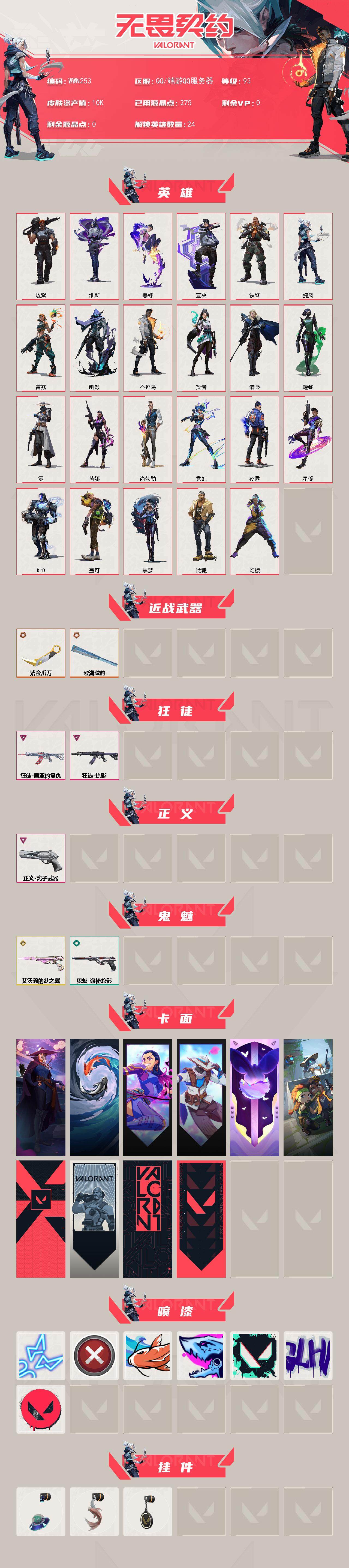 【wwn253】终极3/传奇1/卓越3/皮肤22/等级93/段位:白银/幻棱/炼狱/维斯/暮蝶/钛狐/壹决/铁臂/捷风/雷兹/幽影/不死鸟/贤者/猎枭/蝰蛇/零/芮娜/尚勃勒/霓虹/夜露/星礈/k/o/盖可/黑梦/近战武器-紫金爪刀/近战武器-澄湖潋滟/狂徒-掠影/狂徒-盖亚的复仇/正义-离子武器/鬼魅-艾沃莉的梦之翼/鬼魅-诡秘蛇影/银弹猎手 卡面/红鳞松叶 卡面/无畏契约go!第一卷:芮娜 卡面/无畏契约go!第一卷:零 卡面/化茧成蝶 卡面/别冒尖 卡面/代号红色 卡面/新兵报到 卡面/v契约 卡面/无畏契约 卡面/霓光四射 喷漆/买装还是存钱 喷漆/红鳞 喷漆/暴走萝莉 喷漆/胜利属于无畏契约 喷漆/glhf 喷漆/无畏契约 喷漆/天外飞客 挂饰/红鳞松叶 挂饰/无畏契约 纪念币 挂饰