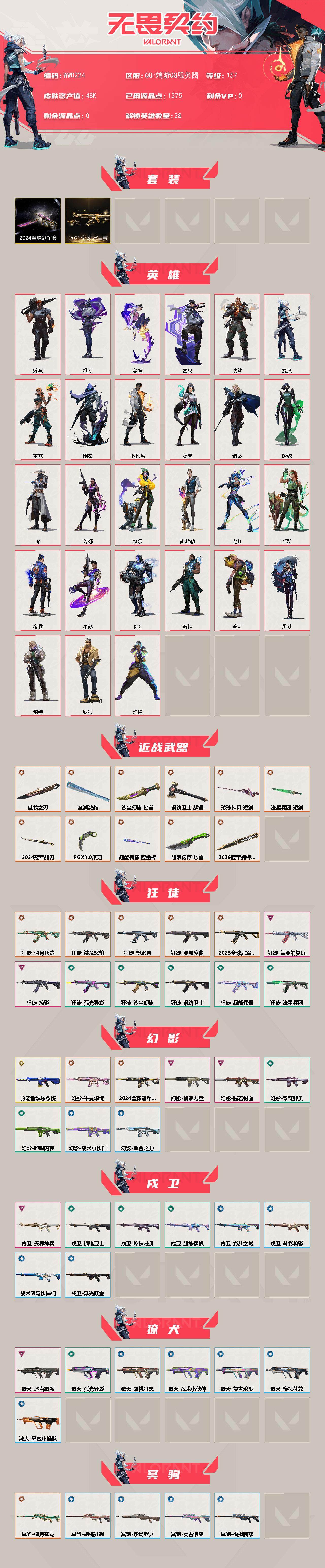 【wwd224】终极22/传奇1/卓越9/皮肤116/等级157/段位:黄金/2025全球冠军赛套装/2024全球冠军赛套装/幻棱/炼狱/维斯/暮蝶/钛狐/壹决/铁臂/捷风/雷兹/幽影/不死鸟/贤者/猎枭/蝰蛇/零/芮娜/奇乐/尚勃勒/霓虹/斯凯/夜露/星礈/k/o/海神/盖可/黑梦/钢锁/近战武器-2025全球冠军赛 蝴蝶刀/2024全球冠军赛-战刀/rgx-11z-pro//3.