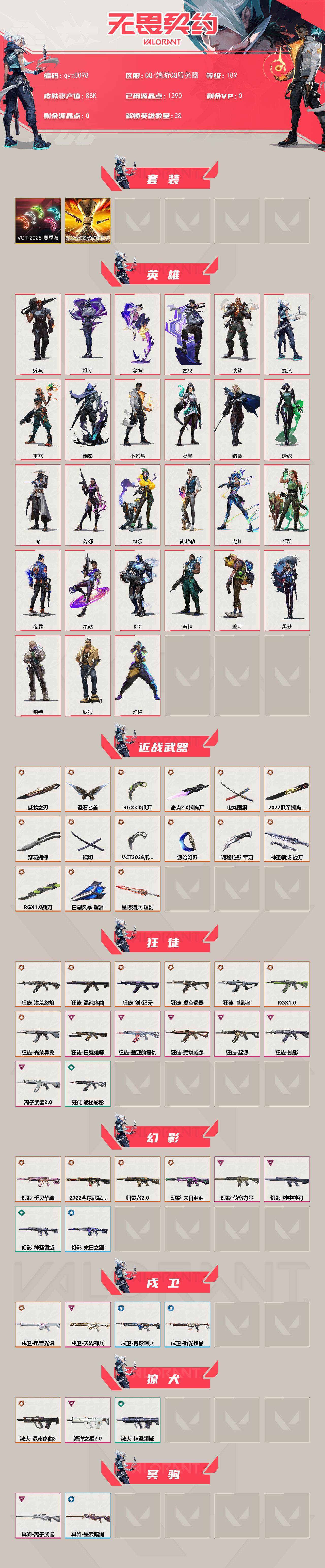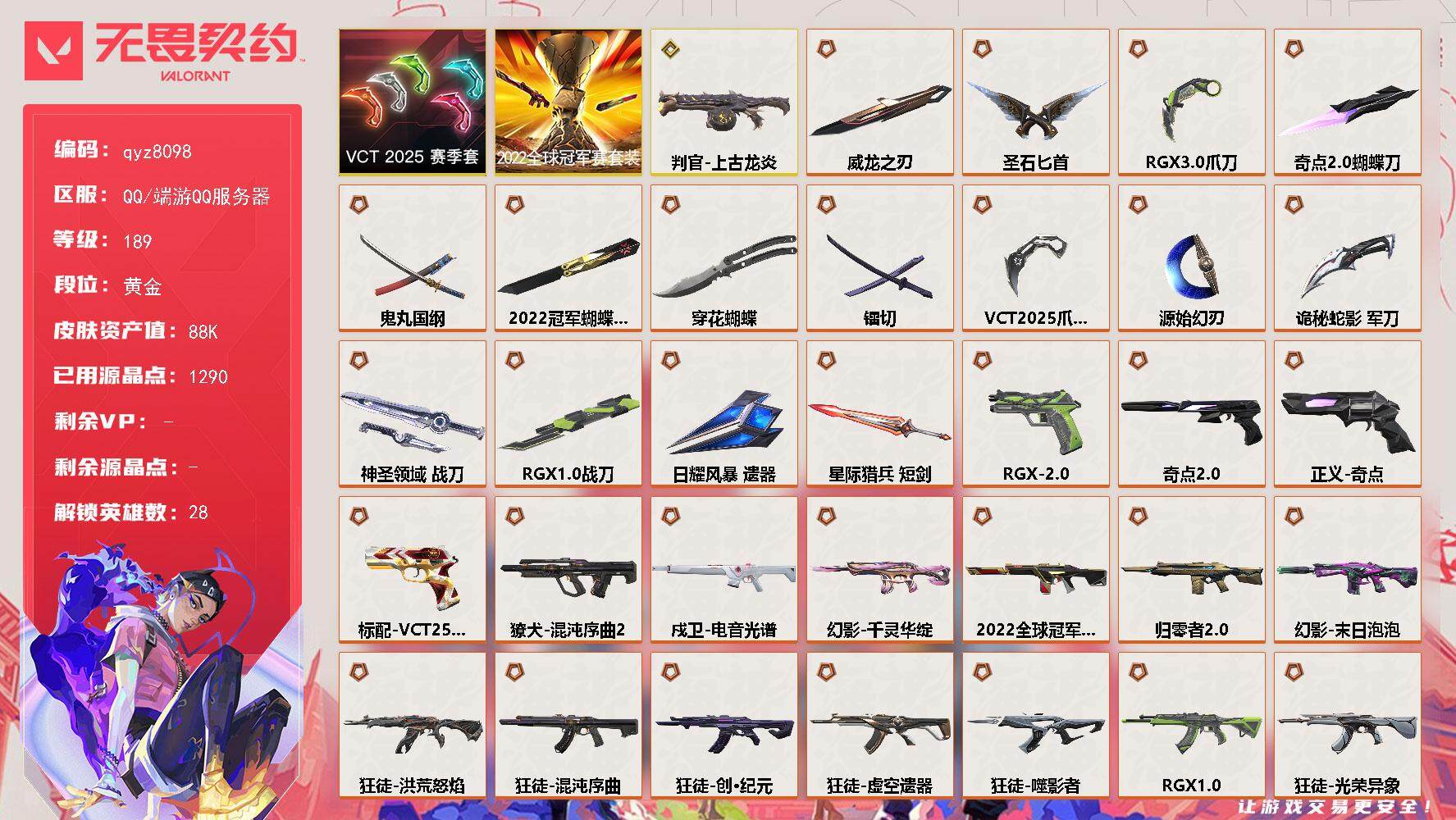 25爪刀-22套-侦察幻影-威龙-显卡爪-鬼丸-奇点蝴蝶-混沌ak-盖亚-奇点正义-镭切-qyz8098-亮点皮肤:-幻影-2022全球冠军赛蝴蝶刀-2022全球冠军赛-套装:-vct-2025赛季礼包2022全球冠军赛-近战武器皮肤:-圣石匕首威龙之刃爪刀-rgx-11z-pro-30蝴蝶刀-奇点//20鬼丸国纲穿花蝴蝶镭切神圣领域-战刀vct-2025-爪刀源始幻刃诡秘蛇影rgx-11z-pro-战刀-步呛皮肤:-狂徒-盖亚的复仇幻影-侦察力量狂徒-起源戍卫-天界神兵狂徒-耀鳞威龙狂徒-洪荒怒焰幻影-千灵华绽狂徒-日冕雄师狂徒-混沌序曲狂徒-掠影幻影-归零者//20狂徒-创纪元獠犬-海洋之星20狂徒-虚空遗器狂徒-噬影者狂徒-离子武器20幻影-神中神罚戍卫-电音光谱狂徒-rgx-11z-pro狂徒-光荣异象幻影-末日泡泡獠犬-混沌序曲20-佩呛皮肤:-正义-奇点鬼魅-奇点//20标配-vct25xedg标配-rgx-11z-pro//20标配-万铀引力辐爆者-狙击呛皮肤:-冥驹-离子武器莽侠-神中神罚-冲锋呛皮肤:-骇灵-海洋之星骇灵-神中神罚-霰弹呛皮肤:-雄鹿-起源判官-上古龙炎-机呛皮肤:-奥丁-海洋之星20-亮点:-【qyz8098】【套装】:2022全球冠军赛套装,vct-2025-赛季套装【英雄】:幻棱,炼狱,维斯,暮蝶,钛狐,壹决,铁臂,捷风,雷兹,幽影,不死鸟,贤者,猎枭,蝰蛇,零,芮娜,奇乐,尚勃勒,霓虹,斯凯,夜露,星礈,k/o,海神,盖可,黑梦,钢锁【近战-武器】:近战武器-2022全球冠军赛-蝴蝶刀,近战武器-rgx-11z-pro-战刀,近战武器-穿花蝴蝶,近战武器-奇点//20-蝴蝶刀,近战武器-vct-2025-爪刀,近战武器-rgx-11z-pro//30-爪刀,近战武器-镭切,近战武器-威龙之刃,近战武器-鬼丸国纲,近战武器-源始幻刃,近战武器-圣石匕首,近战武器-诡秘蛇影-军刀,近战武器-神圣领域-战刀,近战武器-日耀风暴-遗器,近战武器-星际猎兵-短剑【狂徒】:狂徒-洪荒怒焰,狂徒-混沌序曲,狂徒-创纪元,狂徒-虚空遗器,狂徒-噬影者,狂徒-rgx-11z-pro,狂徒-光荣异象,狂徒-掠影,狂徒-盖亚的复仇,狂徒-起源,狂徒-日冕雄师,狂徒-耀鳞威龙,狂徒-离子武器//20,狂徒-诡秘蛇影【幻影】:幻影-