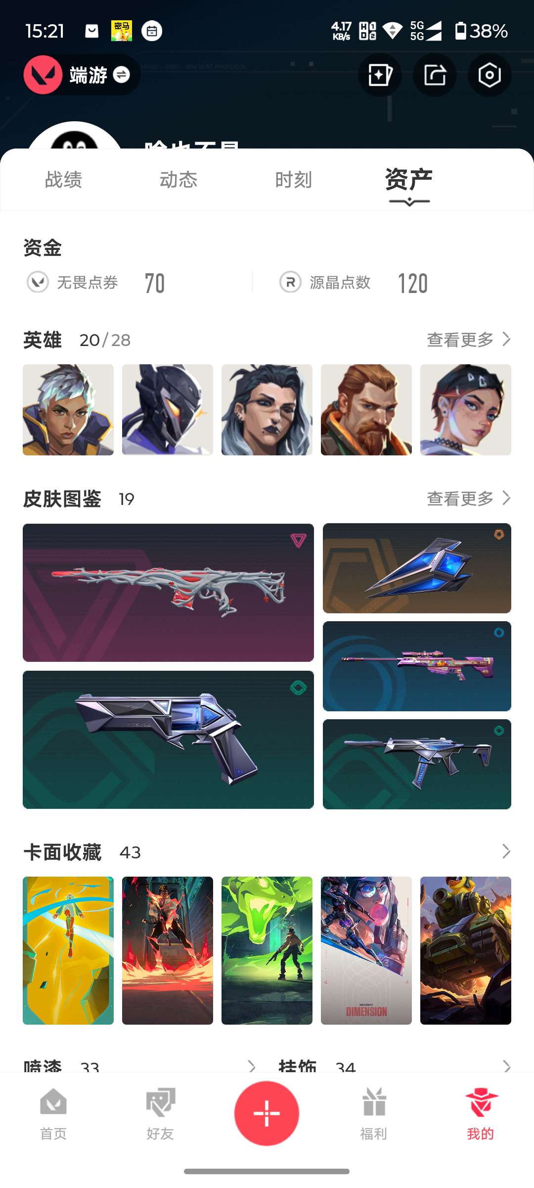 【游戏等级】lv57 【段位】 未定级 【r点】340 【皮肤总价值】9140 【英雄数量】20 【皮肤数量】19 【挂饰数量】34 【卡面数量】43 【喷漆数量】33 【戍卫】戍卫-盖亚的复仇 戍卫-甜蜜战术 【近战武器】近战武器-日耀风暴遗器 【正义】正义-日耀风暴 【冥驹】冥驹-甜蜜战术 【骇灵】骇灵-日耀风暴 【标配】标配-紫阙金琅 【鬼魅】鬼魅-盖亚的复仇 鬼魅-