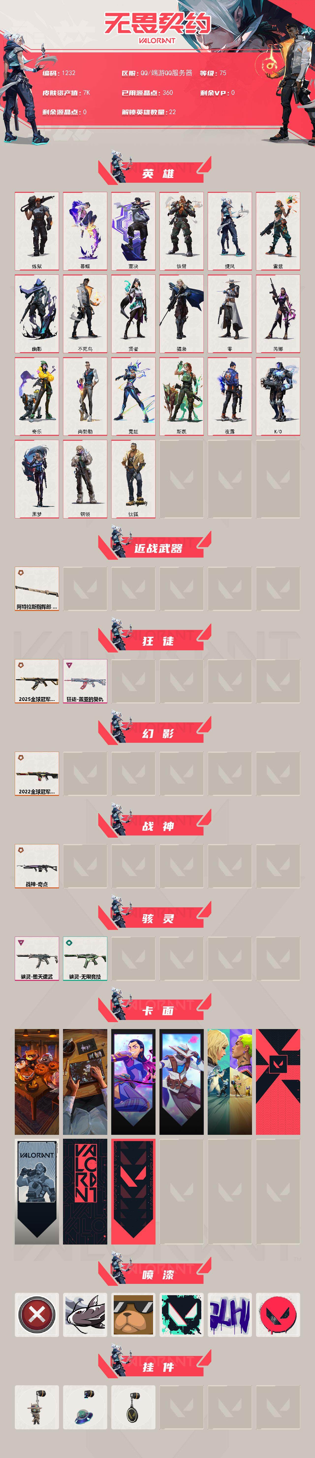 【1232】欢 255604 【英雄】:炼狱,暮蝶,钛狐,壹决,铁臂,捷风,雷兹,幽影,不死鸟,贤者,猎枭,零,芮娜,奇乐,尚勃勒,霓虹,斯凯,夜露,k/o,黑梦,钢锁 【近战 武器】:近战武器-阿特拉斯指挥部 甩棍 【狂徒】:狂徒-2025全球冠军赛,狂徒-盖亚的复仇 【幻影】:幻影-2022全球冠军赛 【战神】:战神-奇点 【骇灵】:骇灵-堕天遗武,骇灵-无限竞技 【卡面】:南瓜盛典 卡面,浮光跃金 卡面,无畏契约go!第一卷:芮娜 卡面,无畏契约go!第一卷:零 卡面,钢锁vs盖可 卡面,代号红色 卡面,新兵报到 卡面,v契约 卡面,无畏契约 卡面 【喷漆】:买装还是存钱 喷漆,松叶 喷漆,旅行小熊 喷漆,胜利属于无畏契约 喷漆,glhf 喷漆,无畏契约 喷漆 【挂饰】:无畏契约go!第一卷 零 挂饰,天外飞客 挂饰,无畏契约 纪念币 挂饰