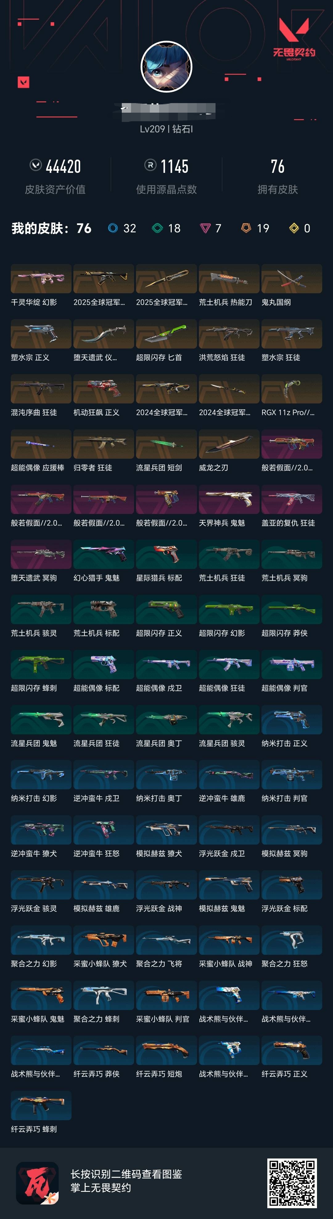 【25冠军套 24冠军套 般若套 千灵华绽 幻影】【游戏等级】lv209 【段位】 钻石i 【r点】1145 【皮肤总价值】44420 【英雄数量】28 【皮肤数量】76 【挂饰数量】99 【卡面数量】135 【喷漆数量】140 【幻影】幻影-千灵华绽 幻影-纳米打击 幻影-超限闪存 幻影-2024全球冠军赛 幻影-聚合之力 【鬼魅】鬼魅-幻心猎手 鬼魅-天界神兵 鬼魅-