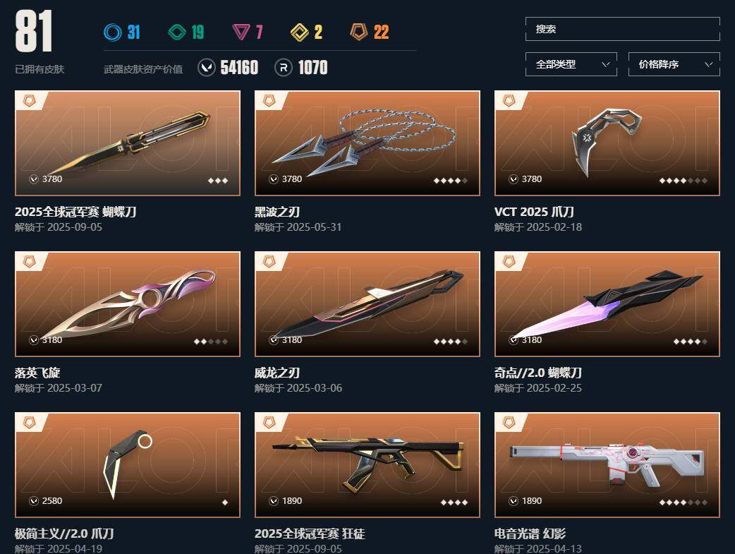 【1237】欢 228979【套装】:2025全球冠军赛套装,vct 2025 赛季套装 【英雄】:幻棱,炼狱,暮蝶,壹决,铁臂,捷风,雷兹,幽影,不死鸟,贤者,猎枭,蝰蛇,零,芮娜,奇乐,尚勃勒,霓虹,斯凯,k/o,盖可,黑梦 【近战 武器】:近战武器-2025全球冠军赛 蝴蝶刀,近战武器-奇点//2.0 蝴蝶刀,近战武器-vct 2025 爪刀,近战武器-黑波之刃,近战武器-落英飞旋,近战武器-威龙之刃,近战武器-极简主义//2.0 爪刀,近战武器-诡秘蛇影 军刀,近战武器-神圣领域 战刀,近战武器-日耀风暴 遗器,近战武器-阿特拉斯指挥部 甩棍 【狂徒】:狂徒-超时空卫队,狂徒-2025全球冠军赛,狂徒-洪荒怒焰,狂徒-混沌序曲,狂徒-机动狂飙,狂徒-rgx 11z pro,狂徒-光荣异象,狂徒-堕天遗武,狂徒-掠影,狂徒-盖亚的复仇,狂徒-紫阙金琅,狂徒-诡秘蛇影 【幻影】:幻影-洪荒怒焰,幻影-电音光谱,幻影-紫阙金琅//2.0,幻影-神圣领域,幻影-末日之翼,幻影-电音光谱 【戍卫】:戍卫-月球哨兵,戍卫-折光棱晶 【獠犬】:獠犬-神圣领域 【冥驹】:冥驹-堕天遗武,冥驹-星云暗涌 【飞将】:飞将-末日之翼 【莽侠】:莽侠-诡秘蛇影,莽侠-月球哨兵 【战神】:战神-神圣领域 【奥丁】:奥丁-末日之翼 【判官】:判官-诡秘蛇影 【雄鹿】:雄鹿-月球哨兵 【骇灵】:骇灵-无限竞技,骇灵-星云暗涌 【蜂刺】:蜂刺-星云暗涌,蜂刺-折光棱晶 【标配】:标配-折光棱晶 【vct手呛】:标配-vct25 x edg 【正义】:正义-奇点,正义-西部未来,正义-月球哨兵 【鬼魅】:鬼魅-超时空卫队,鬼魅-天界神兵,鬼魅-诡秘蛇影,鬼魅-星云暗涌 【狂怒】:狂怒-神圣领域 【短炮】:短炮-末日之翼 【卡面】:南瓜盛典 卡面,热舞环节 卡面,正义的化身 卡面,超能偶像 卡面,树懒大作战 卡面,clutch 卡面,梦幻奶茶 卡面,沙雕爆能器 卡面,无畏契约go!第一卷:芮娜 卡面,无畏契约go!第一卷:零 卡面,无垠星环 卡面,《双城之战》金克丝 卡面,战术小伙伴 卡面,无畏契约go!第一卷:贤者 卡面,钢锁vs盖可 卡面,代号红色 卡面,新兵报到 卡面,v契约 卡面,无畏契约 卡面 【喷漆】:超级粉丝 喷漆,捷风差距 喷漆,审判之爪 喷漆,新潮流 喷漆,买装还是存钱 喷漆,酷熊冲浪 喷漆,无畏契约go!第一卷:芮娜 喷漆,红鳞 喷漆,无畏契约go!第一卷:贤者 喷漆,无畏契约go!第一卷:奇乐 喷漆,飓刃涂鸦 喷漆 ,放下武器 喷漆,胜利属于无畏契约 喷漆,glhf 喷漆,无畏契约 喷漆 【挂饰】:鱼骨头 挂饰,薰衣草之心 挂饰,袖珍捷风 挂饰,z世代特饮 挂饰,第九季//第一幕 纪念币 挂饰,vct x edg 挂饰,传世莲华 挂饰,天外飞客 挂饰,红鳞松叶 挂饰,《双城之战》魄罗 挂饰,海豹的认可 挂饰,无畏契约 纪念币 挂饰